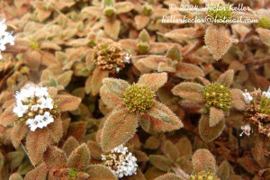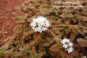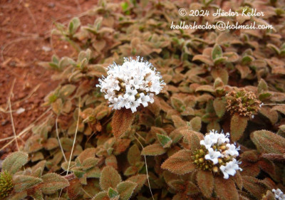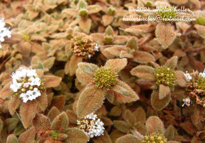 Sufrútice rastrero cespitoso, de 7-25 cm de largo; tallos ramificados, subtetrágonos, pubescentes, con nudos radicantes. Hojas sésiles, pseudoverticiladas, elípticas u ovadas, de 4-13 × 2,5-4,5 mm, coriáceas, densamente pubescentes, con 3-4 pares de nervios secundarios subopuestos apenas notables, ápice agudo y base atenuada, ciliados. Vaina estipular obtriangular, de 1-1,5 mm de largo, pubescente; lacinias 7-8, pilosas. Inflorescencias con 1 glomérulo apical, de 8-20 mm de diámetro; brácteas 4-6, apenas más largas que el diámetro del glomérulo. Flores sésiles; hipanto obcónico, de 2,5-3 mm de largo, pubescente en la mitad superior; cáliz 4-partido, lóbulos angostamente triangulares, de 2-3 mm de largo, los márgenes pilosos; corola infundibuliforme, de 5-7 mm de largo, blanca, externamente pilosa en la mitad superior, internamente con papilas dispersas sobre los lóbulos y anillo de pelos moniliformes en la mitad del tubo corolino; estambres con anteras de 1-1,5 mm de largo, celestes o azules; estilo de 5-5,5 mm de largo, estigma 2-lobado. Fruto una cápsula obovoide, de 2,5-3 mm de largo, pilosa en la mitad superior, valvas dehiscentes. Semillas de contorno elíptico-ovado, de 1,6-2,3 × 0,5-0,8 mm, cara ventral con surco longitudinal profundo cubierto por el estrofíolo y por un elaiosoma cónico en la mitad o tercio superior; exotesta retículo foveada.