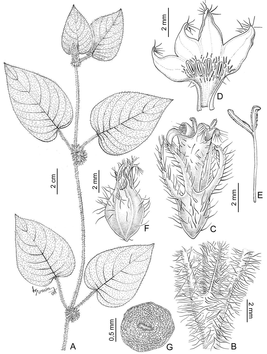 A. Rama con inflorescencias sésiles. B. Nudo con estípula y base de los pecíolos. C-E. Flor longistila: C, vista lateral; D, corola desplegada y androceo; E, estilo. F. Fruto maduro. G. Semilla, cara ventral.