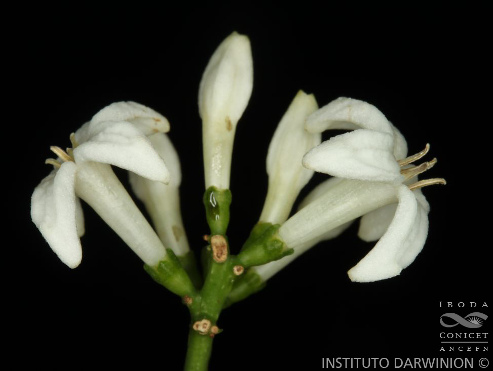 Arbusto o árbol de 2-8(-12) m de alto; tallos delgados, glabros. Hojas con pecíolo de 3-25 mm de largo; láminas elíptico-lanceoladas a oblongo-lanceoladas, de 60-140 × 30-60 mm, base aguda o cuneada, ápice acuminado, glabras, cartáceas o subcoriáceas, 5-8 nervios secundarios, con puntuaciones traslúcidas, con o sin domacios; estípulas triangulares, acuminadas, caducas. Inflorescencias terminales espiciformes o panículas reducidas, paucifloras; pedúnculo de 1,5-4,5 cm de largo. Flores perfumadas, sésiles o subsésiles; botones florales 4-gonos-fusiformes, ápice agudo con un par de brácteas triangulares u oblongas; hipanto obcónico, de 2 mm de largo; cáliz 4-dentado, de 1 mm de largo, glanduloso en la cara interna, dientes ovados, subobtusos; corola cilíndrico-infundibuliforme, de 10-20 mm de largo, blanca, glabra, 4 lóbulos triangulares, de prefloración valvar; estambres semiexertos; estilo 2-fido, incluso; disco grueso, anular. Fruto una drupa elipsoide, de 9-15 × 6-7 mm, amarillenta, el cáliz persistente.