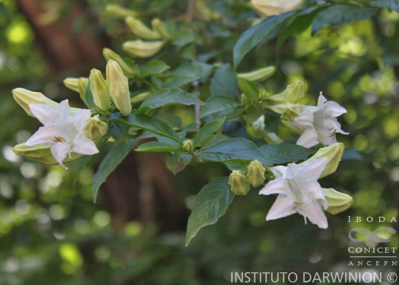 Árbol o arbusto de 2 m de alto, a veces árboles apoyantes; ramas con lenticelas, glabras o pubérulas. Hojas con láminas ovadas, oblongas o elípticas, de (5-)6,6-10,5 × (2-)2,8-5,2 cm, base atenuada, ápice agudo, papiráceo-cartáceas, pubescentes con indumento más denso sobre las venas y venillas; 6-7 venas secundarias, domacios en mechón de pelos; pseudopecíolos de 7-9 mm de largo, acanalados, pubérulos; estípulas interpeciolares de 3-4 mm de largo. Inflorescencias cimosas terminales, a veces axilares; brácteas foliáceas lineares, de 10-12 mm de largo; bractéolas filiformes, de 4 mm de largo. Flor con pedicelo de 5-7 mm de largo; hipanto pubescente; cáliz con 6 lóbulos lineares, de 17-19 mm de largo; corola de 48-69 mm de largo, rosada a lila o blanca con el centro rosa, externamente pubescente y con el tubo corolino arqueado; estambres 6, adnatos en la base de la corola, filamentos de 40-43 mm de largo, pubérulos; anteras de 12-15 mm de largo, basifijas; estilo filiforme, de 62-66 mm de largo, estigma 2-lobado-capitado, glabro. Fruto una cápsula de contorno obovado, de 14-27 mm de largo, lateralmente comprimida, sin lenticelas, coriáceas, pubescente, con el cáliz persistente, castañas a negras. Semillas elipsoideo-ovoideas, de 7-8 × 5-6 mm, aladas.