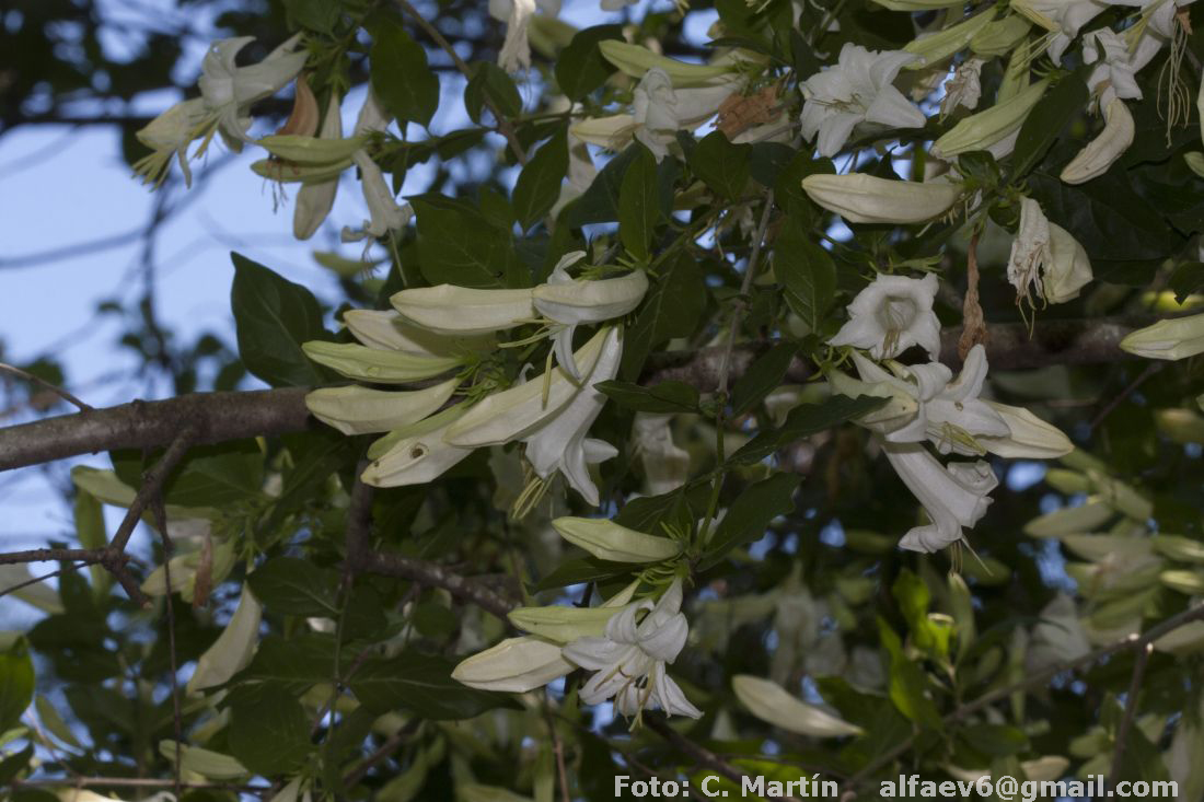 Árbol o arbusto de 2 m de alto, a veces árboles apoyantes; ramas con lenticelas, glabras o pubérulas. Hojas con láminas ovadas, oblongas o elípticas, de (5-)6,6-10,5 × (2-)2,8-5,2 cm, base atenuada, ápice agudo, papiráceo-cartáceas, pubescentes con indumento más denso sobre las venas y venillas; 6-7 venas secundarias, domacios en mechón de pelos; pseudopecíolos de 7-9 mm de largo, acanalados, pubérulos; estípulas interpeciolares de 3-4 mm de largo. Inflorescencias cimosas terminales, a veces axilares; brácteas foliáceas lineares, de 10-12 mm de largo; bractéolas filiformes, de 4 mm de largo. Flor con pedicelo de 5-7 mm de largo; hipanto pubescente; cáliz con 6 lóbulos lineares, de 17-19 mm de largo; corola de 48-69 mm de largo, rosada a lila o blanca con el centro rosa, externamente pubescente y con el tubo corolino arqueado; estambres 6, adnatos en la base de la corola, filamentos de 40-43 mm de largo, pubérulos; anteras de 12-15 mm de largo, basifijas; estilo filiforme, de 62-66 mm de largo, estigma 2-lobado-capitado, glabro. Fruto una cápsula de contorno obovado, de 14-27 mm de largo, lateralmente comprimida, sin lenticelas, coriáceas, pubescente, con el cáliz persistente, castañas a negras. Semillas elipsoideo-ovoideas, de 7-8 × 5-6 mm, aladas.