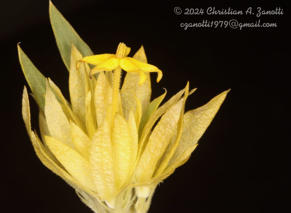 Hierba perenne, formando matas amplias; raíz profunda y tallos subterráneos numerosos; tallos aéreos postrados, pubescentes, con follaje denso. Hojas elípticas, de 25-40 × 5-14 mm, agudas, obtusas a redondeadas en el ápice, base atenuada en un largo pseudopecíolo, pubescentes; estípulas de borde irregular hasta casi liso, pubescentes, soldadas entre sí hasta libres en los nudos apicales. Inflorescencias densas con brácteas foliáceas, 3-partidas; cáliz con 5 lóbulos elípticos, de 10-15 × 2-4 mm, ligeramente desiguales entre sí, agudos, amarillos, con diminutos apéndices en la base; corola de 28-33 mm de largo, pubescente en la superficie externa, amarilla, lóbulos elípticos, de 4-5 mm de largo, agudos, glabros en la cara interna, tubo corolino de 0,8-1 mm de ancho, ligeramente ensanchando en la garganta, sobre todo en las flores longistilas, en su interior con pelos esparcidos y reemplazados hacia la base por pelos muy cortos, papilosos; estambres exertos o inclusos con anteras ca, 2,5 mm de largo; estilo filiforme, ca. 15 mm de largo, incluso o exerto, de ápice 2-fido. Fruto subgloboso de 15 mm de largo, pubérulo, coronado por lóbulos calicinos hasta de 12-13 mm de largo, acrescentes. Semillas de 2-3 mm de largo.