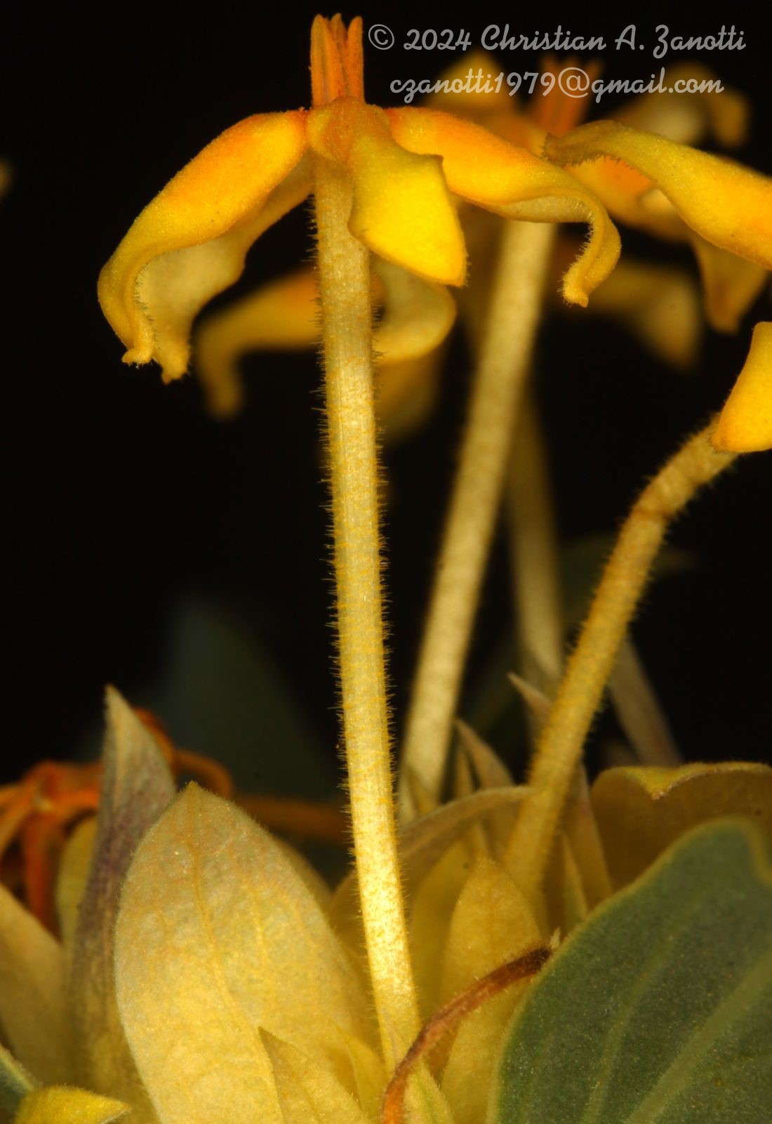 Hierba perenne, formando matas amplias; raíz profunda y tallos subterráneos numerosos; tallos aéreos postrados, pubescentes, con follaje denso. Hojas elípticas, de 25-40 × 5-14 mm, agudas, obtusas a redondeadas en el ápice, base atenuada en un largo pseudopecíolo, pubescentes; estípulas de borde irregular hasta casi liso, pubescentes, soldadas entre sí hasta libres en los nudos apicales. Inflorescencias densas con brácteas foliáceas, 3-partidas; cáliz con 5 lóbulos elípticos, de 10-15 × 2-4 mm, ligeramente desiguales entre sí, agudos, amarillos, con diminutos apéndices en la base; corola de 28-33 mm de largo, pubescente en la superficie externa, amarilla, lóbulos elípticos, de 4-5 mm de largo, agudos, glabros en la cara interna, tubo corolino de 0,8-1 mm de ancho, ligeramente ensanchando en la garganta, sobre todo en las flores longistilas, en su interior con pelos esparcidos y reemplazados hacia la base por pelos muy cortos, papilosos; estambres exertos o inclusos con anteras ca, 2,5 mm de largo; estilo filiforme, ca. 15 mm de largo, incluso o exerto, de ápice 2-fido. Fruto subgloboso de 15 mm de largo, pubérulo, coronado por lóbulos calicinos hasta de 12-13 mm de largo, acrescentes. Semillas de 2-3 mm de largo.