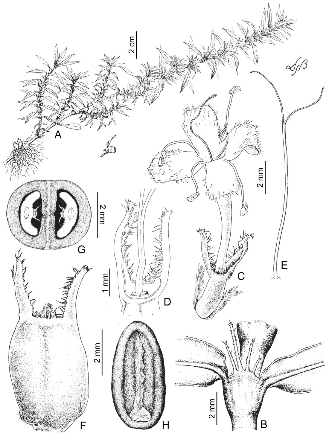 A. Planta. B. Estípula multifimbriada. C. Flor. D. Ápice del hipanto, disco del nectario, base del estilo 2-fido y lóbulos del cáliz. F. Fruto. G. Corte transversal de fruto con pared esponjosa. H. Semilla, vista ventral.