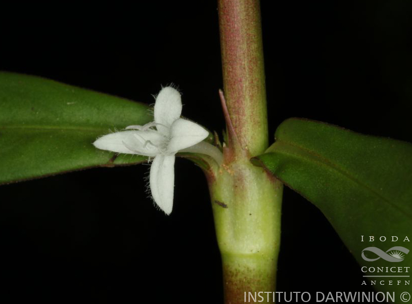 Hierba rastrera, con nudos radicantes; tallos subtetrágonos, glabros, fistulosos. Hojas con láminas obovadas, de 15-50 × 7-15 mm, glabras, base atenuada u obtusa, sésiles, ápice obtuso, apiculado o agudo, el margen suavemente ondulado, escabriúsculo, ciliado en la base, a veces con papilas ásperas sobre el nervio medio de la cara abaxial; vaina estipular de 4-8 mm de largo, con una fimbria mayor y 2 menores. Inflorescencias sésiles, 1(-2) floras. Flores con hipanto de 5-5,5 mm de largo, glabro; cáliz con 2 lóbulos tubulados o lineares, de 2-3,5 mm de largo, con escasos pelos sobre el margen y el dorso; corola de 8-10,8 mm de largo, pilosa en la cara interna de los lóbulos, tubo glabro; estilo 2-fido, filiforme, exerto; estambres exertos, filamentos de 2 mm de largo, anteras de 1,5-2 mm de largo. Fruto elipsoide u ovoide, de 6 de mm de largo, 1-2 por axila foliar y casi oculto por la vaina, la que desgarra al madurar, a veces con la cara casi plana en contacto con el tallo y la cara opuesta convexa, glabro o pubérulo cerca del polo apical. Semillas subelipsoides, de 4-4,5 mm de largo, reticulado-foveoladas, con surco estrecho alrededor del estrofíolo, algo ensanchado en los extremos.