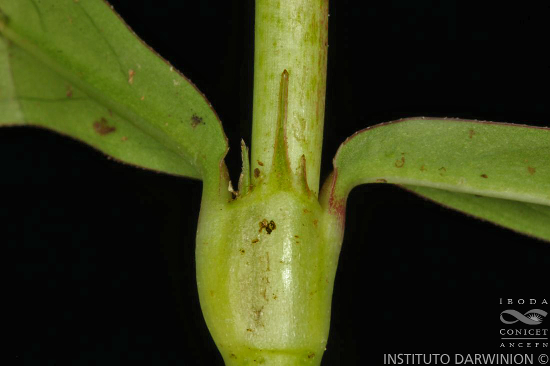 Hierba rastrera, con nudos radicantes; tallos subtetrágonos, glabros, fistulosos. Hojas con láminas obovadas, de 15-50 × 7-15 mm, glabras, base atenuada u obtusa, sésiles, ápice obtuso, apiculado o agudo, el margen suavemente ondulado, escabriúsculo, ciliado en la base, a veces con papilas ásperas sobre el nervio medio de la cara abaxial; vaina estipular de 4-8 mm de largo, con una fimbria mayor y 2 menores. Inflorescencias sésiles, 1(-2) floras. Flores con hipanto de 5-5,5 mm de largo, glabro; cáliz con 2 lóbulos tubulados o lineares, de 2-3,5 mm de largo, con escasos pelos sobre el margen y el dorso; corola de 8-10,8 mm de largo, pilosa en la cara interna de los lóbulos, tubo glabro; estilo 2-fido, filiforme, exerto; estambres exertos, filamentos de 2 mm de largo, anteras de 1,5-2 mm de largo. Fruto elipsoide u ovoide, de 6 de mm de largo, 1-2 por axila foliar y casi oculto por la vaina, la que desgarra al madurar, a veces con la cara casi plana en contacto con el tallo y la cara opuesta convexa, glabro o pubérulo cerca del polo apical. Semillas subelipsoides, de 4-4,5 mm de largo, reticulado-foveoladas, con surco estrecho alrededor del estrofíolo, algo ensanchado en los extremos.