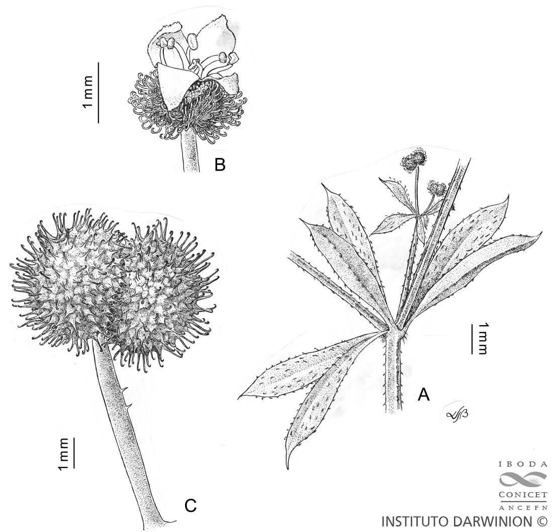 Hierba apoyante o postrada, de 10-90 cm de alto, ramificada, a veces plantas depauperadas escasamente desarrolladas; tallos gráciles, escabrosos, entrenudos 2-10 cm de largo, con tricomas retrorsos, rígidos y aculeados sobre los ángulos. Hojas 6-8-verticiladas; láminas jóvenes espatuladas y pseudopecioladas, las adultas linear-oblongas, oblongo-lanceoladas u ovadas, de 13-31 mm de largo, base atenuada, ápice mucronado, escabrosas, con pelos retrorsos ásperos al tacto, con 1 nervio visible. Inflorescencias indeterminadas; inflorescencias parciales axilares, laxas y paucifloras, pediceladas, en cimas (1-)2 floras. Flores perfectas; pedicelos de 3-45 mm de largo, a veces reflexos en botones florales; corola rotácea, 4-lobada, blanca o blanco-amarillenta. Frutos secos, con pelos uncinulados, cada mericarpo subesférico.