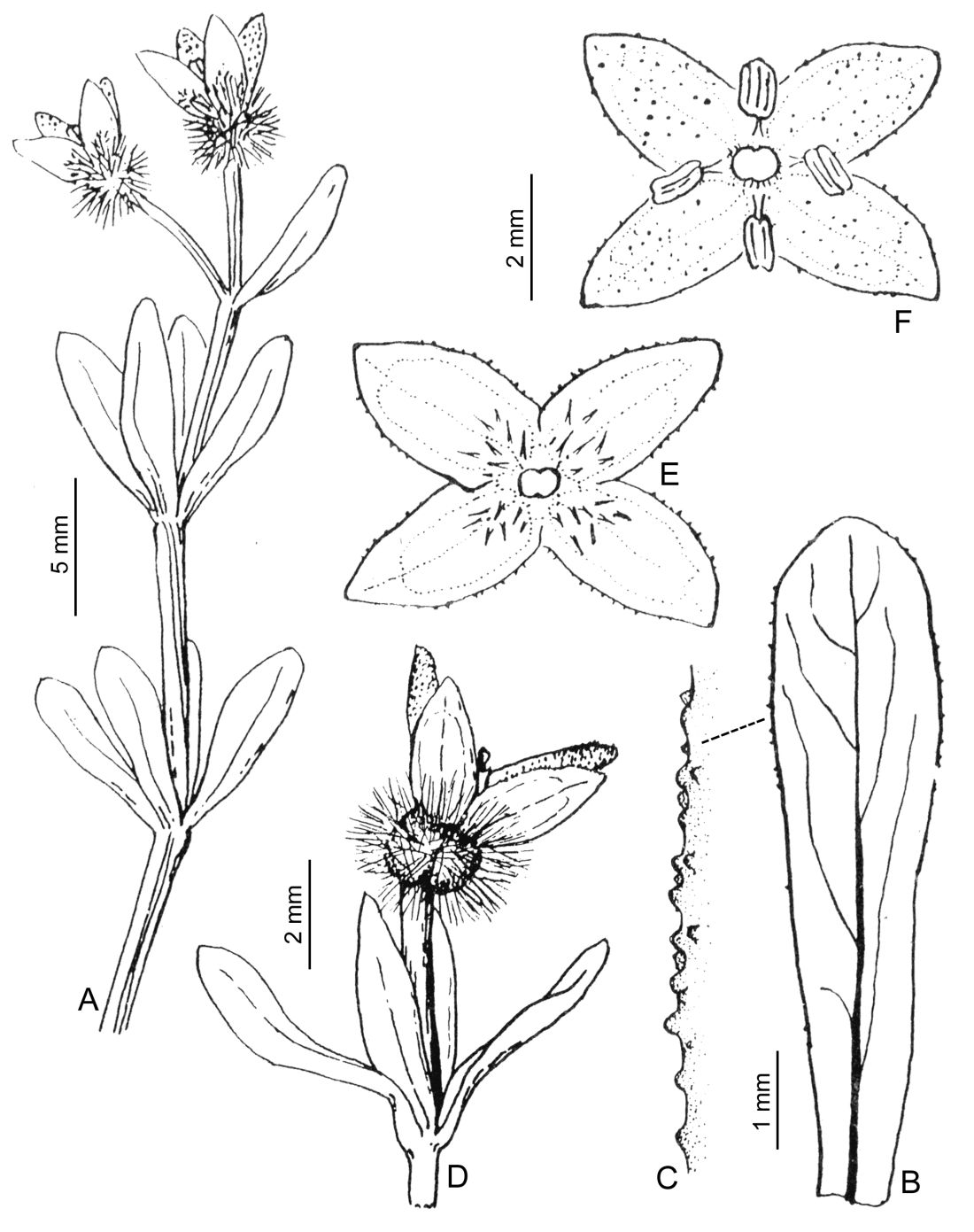 Hierba perenne, de 12 cm de alto; tallos papilosos o glabros. Hojas 4-verticiladas; láminas elípticas o espatuladas, de 4-8 mm de largo, ápice obtuso o redondeado, base ligeramente atenuada, glabras, margen finamente papiloso, con 1 nervio visible, crasas en fresco. Inflorescencias axilares, pedunculadas, 1-2-floras, sin brácteas. Flores imperfectas; pedicelo de 1-1,3 mm de largo; hipanto con pelos largos y sedosos; corola rotácea, 3-3,5 mm de diámetro, lóbulos erguidos, patentes, de 1,8-2 mm de largo, carnosa, color crema, cara interna papilosa en las flores estaminadas y pilosas en las pistiladas, por fuera pilosas en ambos tipos de flores. Fruto piloso, mericarpos subesféricos.