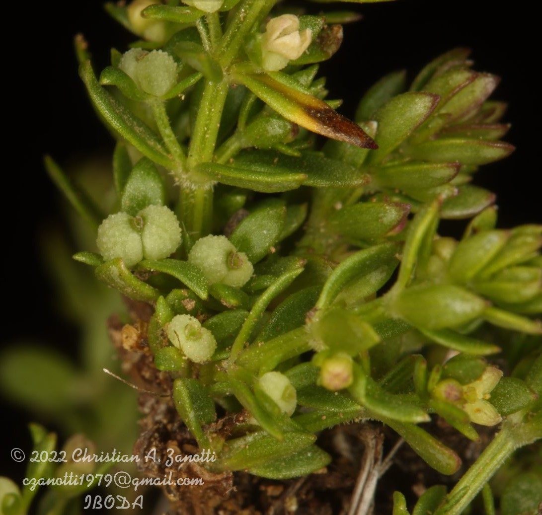 Hierba perenne o sufrútice, de 5-10 cm de alto, muy ramificada, cespitosa, formando matas densas, nigrescentes al secarse; ramas decumbentes, nudos basales radicantes, a menudo cubiertos por el sustrato; tallos filiformes, 4-gonos, glabros, a veces con escasos pelos setulosos cerca de los nudos. Hojas 4-verticiladas; láminas ovadas o elípticas, de 1-4,5 × 1,5 mm, ápice agudo o apiculado, base atenuada en pseudopecíolo, glabras, raramente con 1-3 pelos largos cerca del ápice, con 1 nervio principal escasamente visible, con glándulas axilares. Inflorescencias axilares, 1(-2)-flora, 1-2 por nudo, sin brácteas. Flores perfectas, a veces algunas aparentemente estaminadas; pedicelos de 0,5-2 mm de largo; corola de 1 mm de largo, glabra, con algunos pelos en el dorso de los lóbulos; lóbulos ovados, con papilas en el ápice. Fruto con pelos rectos, rígidos, tan largos como el fruto; mericarpos subelipsoideos.