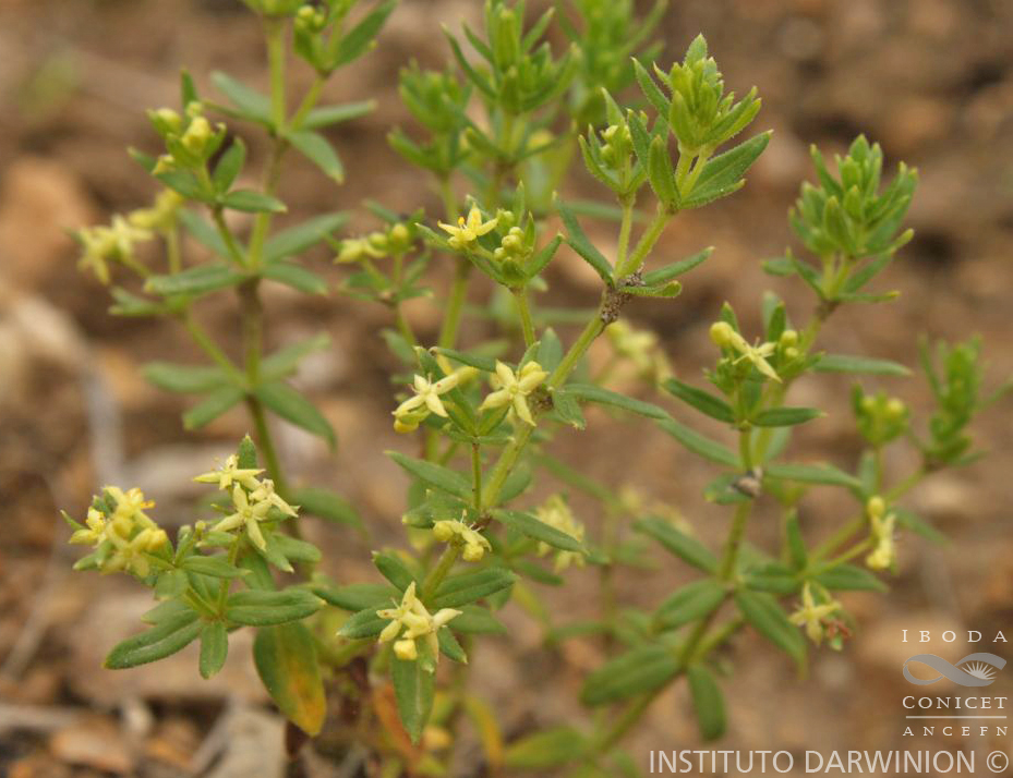 Sufrútices apoyantes, escandentes, dioicas; tallos generalmente frágiles; entrenudos de 20-50 mm de largo, 4-angulares, escabrosos, especialmente en los ángulos. Hojas 4-verticiladas, sésiles; láminas angostamente elípticas o angostamente ovadas, de 8-25 × 2-4 mm, escábridas, especialmente en la cara abaxial, los márgenes y sobre los nervios; con 1 nervio visible, ápice agudo, con una zona glandular translucida; el margen débilmente revoluto. Inflorescencias axilares, laxas, 1-2 cimas por nudo, cada ramita 1-2(-3)-flora; brácteas 2-4, generalmente lineares, de 3-11 × ca. 1 mm, foliáceas, ubicadas en la base de los pedicelos, reduciéndose en tamaño hacia el ápice de la inflorescencia. Flores imperfectas; pedicelo de 2-9 mm de largo, frágiles, con papilas retrorsas; hipanto de las flores pistiladas con pelos largos, antrorsos, marcadamente reducido y pubérulo en las flores estaminadas; corola de 1,5-2 mm de diámetro en las flores estaminadas y de 1,2-1,5 mm de diámetro en las pistiladas; lóbulos ovados, internamente glabros, externamente pubérulos, amarillas; estilo de 0,6 mm de largo en las flores pistiladas, reducido en las estaminadas. Fruto seco, de 2-2,6 mm de largo, separado en dos mericarpos a la madurez, con pelos largos rectos o antrorsos, menores al diámetro del fruto.