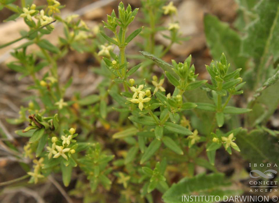 Sufrútices apoyantes, escandentes, dioicas; tallos generalmente frágiles; entrenudos de 20-50 mm de largo, 4-angulares, escabrosos, especialmente en los ángulos. Hojas 4-verticiladas, sésiles; láminas angostamente elípticas o angostamente ovadas, de 8-25 × 2-4 mm, escábridas, especialmente en la cara abaxial, los márgenes y sobre los nervios; con 1 nervio visible, ápice agudo, con una zona glandular translucida; el margen débilmente revoluto. Inflorescencias axilares, laxas, 1-2 cimas por nudo, cada ramita 1-2(-3)-flora; brácteas 2-4, generalmente lineares, de 3-11 × ca. 1 mm, foliáceas, ubicadas en la base de los pedicelos, reduciéndose en tamaño hacia el ápice de la inflorescencia. Flores imperfectas; pedicelo de 2-9 mm de largo, frágiles, con papilas retrorsas; hipanto de las flores pistiladas con pelos largos, antrorsos, marcadamente reducido y pubérulo en las flores estaminadas; corola de 1,5-2 mm de diámetro en las flores estaminadas y de 1,2-1,5 mm de diámetro en las pistiladas; lóbulos ovados, internamente glabros, externamente pubérulos, amarillas; estilo de 0,6 mm de largo en las flores pistiladas, reducido en las estaminadas. Fruto seco, de 2-2,6 mm de largo, separado en dos mericarpos a la madurez, con pelos largos rectos o antrorsos, menores al diámetro del fruto.