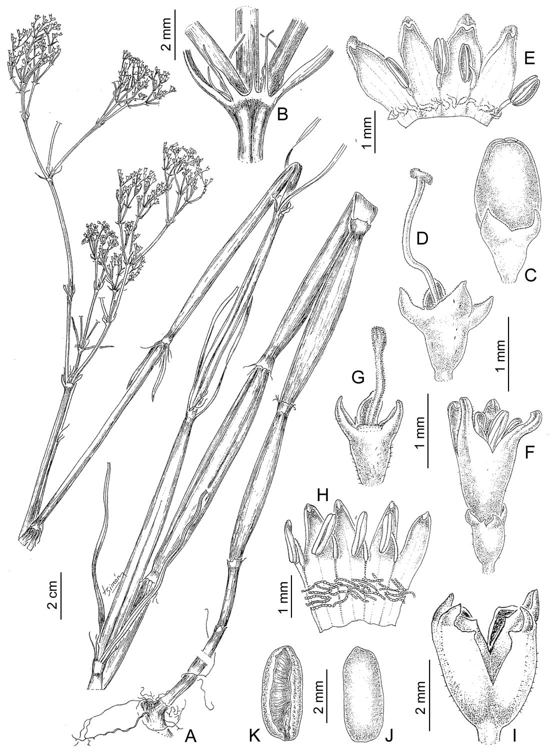 A. Planta. B. Vaina estipular con fimbrias. C-E. Flor longistila: C, alabastro; D, hipanto, cáliz, estilo y estigma; E, interior de la corola desplegada. F-H. Flor brevistila: F, vista lateral; G, hipanto, cáliz, estilo y estigma; H, interior de la corola desplegada. I. Fruto. J-K. Semilla, caras dorsal y ventral, respectivamente.