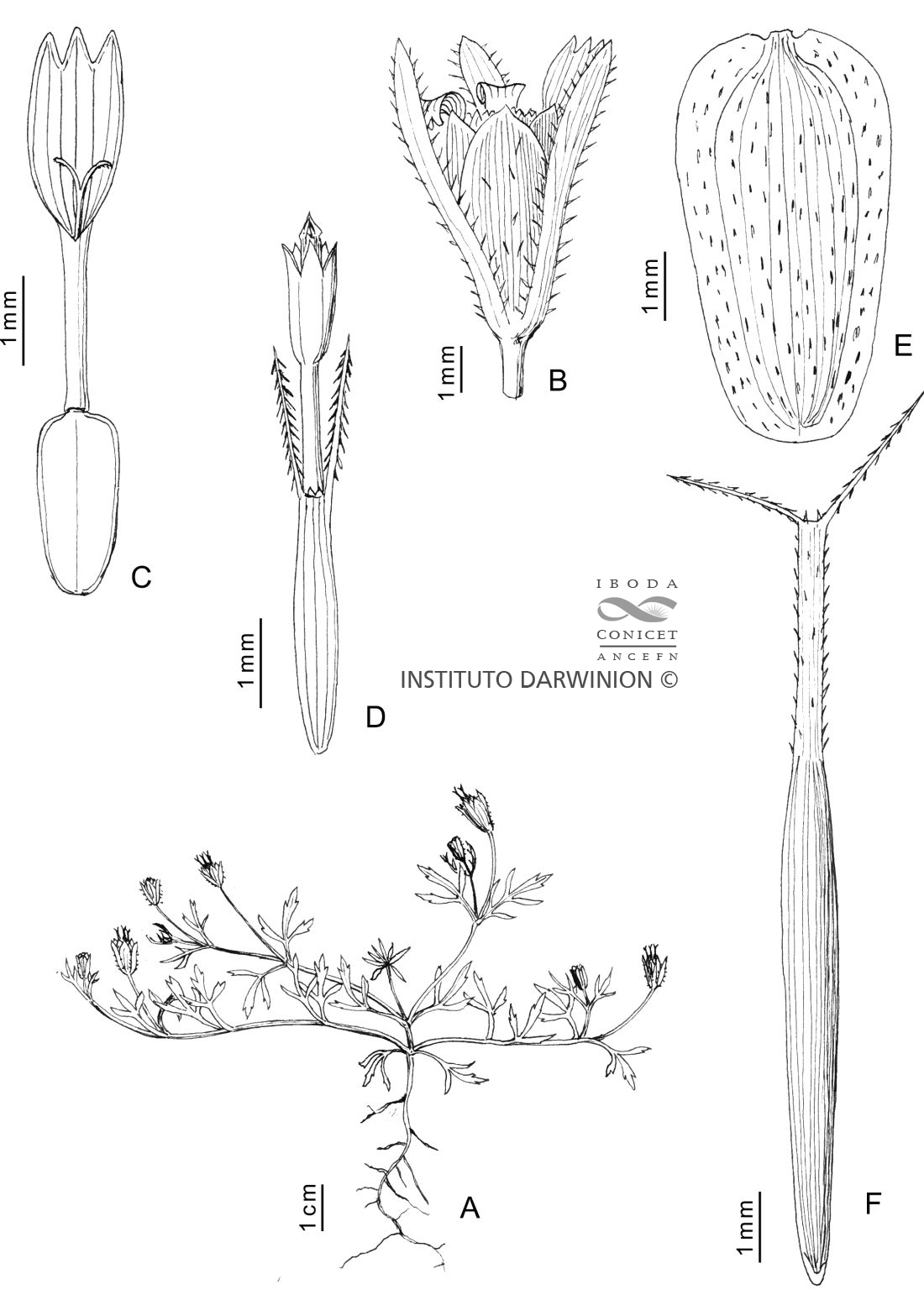Hierbas anuales, pigmeas, hasta de 10 cm de alto, con tallos tendidos o ascendentes, hirsutos. Hojas opuestas; pecíolos con alas angostas; láminas de 3-12 mm de largo, profundamente partidas en 3 segmentos lineares a veces el central a su vez 3- partido, con pelitos ralos hacia la base peciolar. Capítulos pedunculados, terminales o axilares; pedúnculo de 3-30 mm de largo. Involucro acampanado, de 6-10 × 3-4 mm; filarios externos 2-3, oblongos u oblanceolados, herbáceos, ciliados, los internos más cortos, elípticos, glabros. Flores dimorfas, las del margen 3- 5, pistiladas, con lígula amarilla, elíptica, de 2-3 mm de largo, 3- dentada; flores del centro 7-10, perfectas, con corola tubulosa, amarilla, ca. 3 mm de largo. Aquenios del margen obovoides, de 4-6 × 2-3 mm, convexos, estriados y con ala angosta, sin papus; aquenios del centro fusiformes, de 7-9 mm de largo, oscuros, estriados, con rostro corto y grueso. Papus formado por 2 aristas ca. 2 mm de largo, retrorso-pilosas, con escamitas intermedias.
