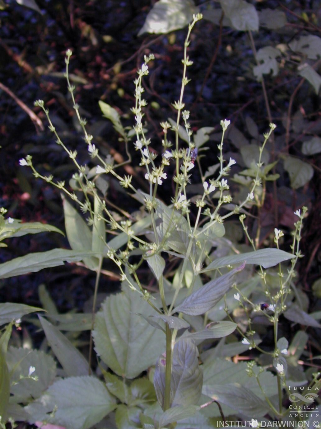 Sufrútice estolonífero; tallos simples, de 30-60 cm de alto, 4-gonos, alados, glabros o ralamente pilosos sobre los ángulos. Hojas elípticas u ovadas, de 35-100 × 15-35 mm, discoloras, vinosas al envejecer, ápice agudo o acuminado y base obtusa, atenuada en pseudopecíolo, con 5-8 pares de nervios secundarios, ligeramente curvos y paralelos, haz glabra o escabriúscula sobre toda la lámina o sólo sobre los nervios y bordes. Vaina estipular de 10-13 mm de largo, escabriúscula o pilosa, fimbrias 5-9, glabras o algo escabriúsculas en la base. Inflorescencia cimoidal, monocasial a pleiocasial, con paracladios en gran parte cincinoides, con inflorescencias parciales contraídas, fasciculadas. Flores con hipanto turbinado, escabriúsculo; cáliz 4-partido, de 2 lóbulos triangular-subulados, de 2,5-3 mm de largo, alternando con otros lóbulos menores y algún dientecito intercalar, glabro, de borde escabriúsculo, o rara vez también con alguna papila en el dorso de los sépalos; corola blanca, de 3,8-4,6 mm de largo, lóbulos más cortos que el tubo. Flor brevistila con superficie interna de la corola con pelos dispersos sobre el tubo y base de los lóbulos, anteras de 0,8-1,2 mm de largo, estilo de 0,8-1,6 mm de largo y ramas estilares de 1 mm de largo. Flor longistila con superficie interna de la corola con pelos moniliformes gruesos sobre los lóbulos y delgados sobre el tubo; anteras de 0,8 mm de largo, estilo de 3,5-4,5 mm de largo, ramas estilares de 1-1,2 mm de largo. Fruto subhemiesférico, de 1,6-2 mm de largo, con superficie escabriúscula o glabra. Semillas de 1,4-1,6 mm de largo, castaña- oscuras, con estrofíolo rodeado de surco profundo.