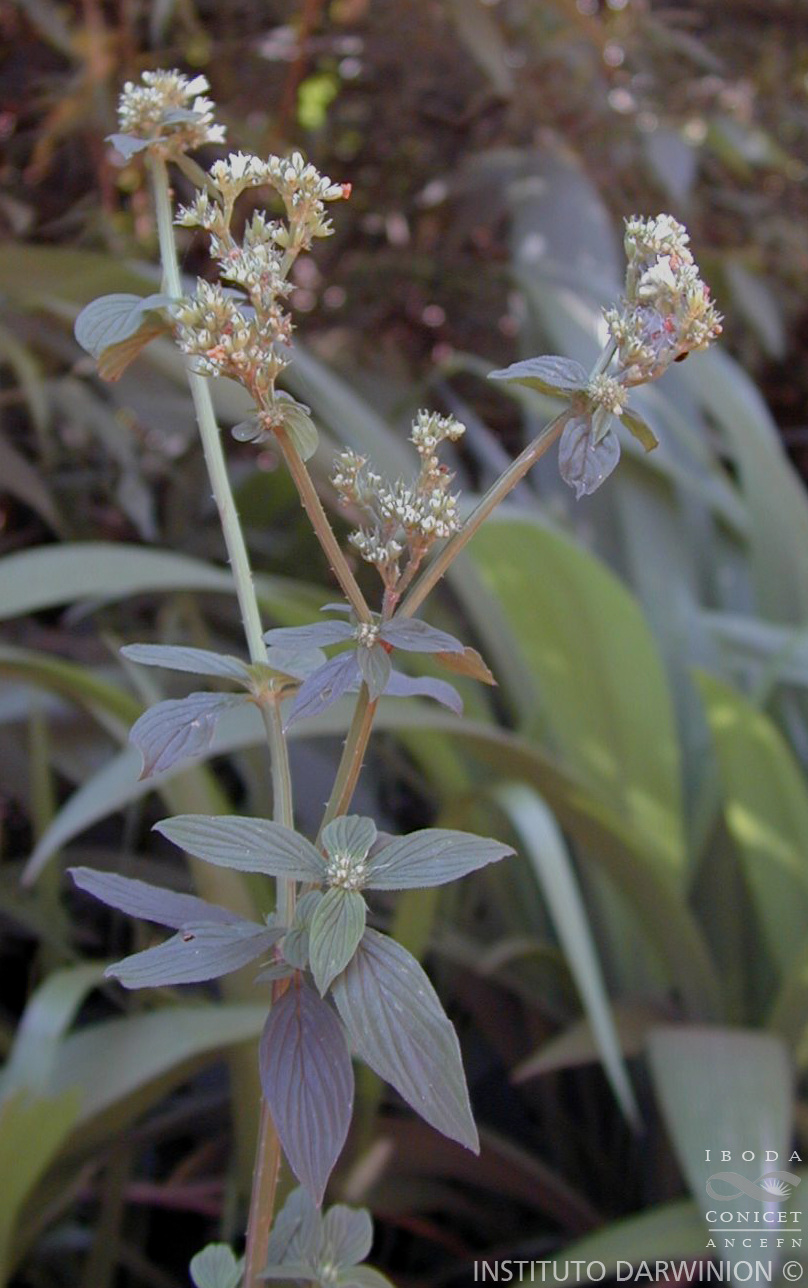 Sufrútice apoyante, de 0,5-1,5 m de alto, sin xilopodio, ramas laterales desarrolladas, rematando en inflorescencias; tallos 4-gonos, glabros, con ángulos marcados, papilosos o con pelos retrorsos. Hojas elípticas u ovado-elípticas, de 20-60(-100) × (2-)6-20(-30) mm, pseudoverticiladas, discoloras, más claras en el envés, ápice agudo a atenuado, base decurrente en pseudopecíolo, cartáceas, glabras o con pelos dispersos en el haz y envés, con 4-6 pares de nervios secundarios, subopuestos, arqueados hacia el ápice, surcados en el haz y prominentes en el envés. Vaina estipular de 1,5-2,5 mm de largo, pubescente y con 5-12 fimbrias filiformes, de 3-8 mm de largo, glabras a pilosas en la base. Inflorescencias tirsoideas laxas, raro comprimidas. Flores con hipanto turbinado, de 1-1,7 mm de largo, glabro; cáliz con 4 lóbulos de 1-1,7 mm de largo, glabros y con margen papiloso o piloso, dientes intercalares presentes; corola externamente papilosa, con papilas más desarrolladas en el extremo superior de los lóbulos. Flor brevistila con corola de 3-4 mm de largo, lóbulos y tubo aproximadamente de la misma longitud, el interior con pelos moniliformes, delgados en el tubo; anteras de 0,7-1 mm de largo, filamentos de 1 mm de largo, estilo y estigma de 1,5-2 mm de largo, ramas estigmáticas oblongo-elípticas con papilas gruesas y cortas. Flor longistila con corola de 2,7-4 mm de largo, lóbulos mayores o iguales que el tubo, en su interior con un anillo de pelos moniliformes, finos y cortos en la mitad del tubo y sendas bandas de pelos gruesos en la mitad de los lóbulos; anteras de 0,7-1 mm de largo, filamentos de 0,5 mm de largo; estilo de 3,7-5 mm de largo, ramas estigmáticas lineares; disco entero, papiloso. Fruto turbinado, de 1,7-3 mm de largo, brevemente pedicelado, glabro. Semillas elipsoides, de 1,7-2,5 mm de largo, foveoladas, castaño-claras, con surco amplio y profundo en la cara ventral, estrofíolo grueso, irregular, fácilmente caedizo, a veces persistente sobre el tabique interlocular.