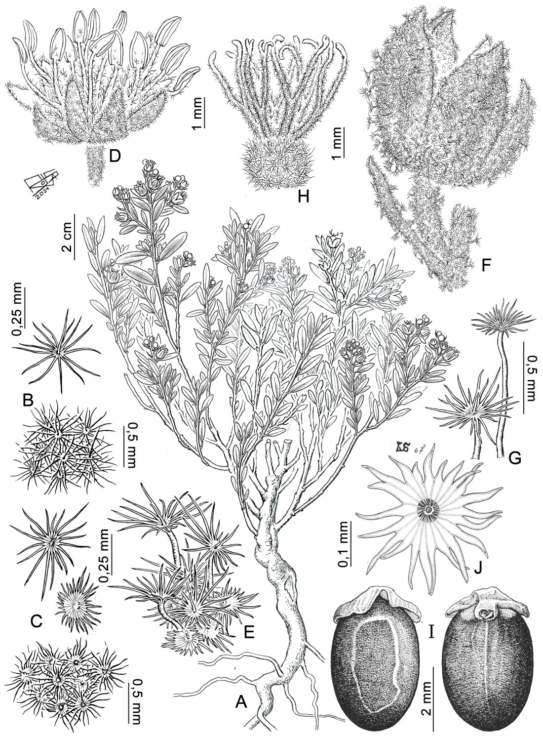 A. Planta. B. Tricomas de la cara adaxial de la lámina foliar. C. Tricomas de la cara abaxial de la lámina foliar. D. Flor estaminada. E. Tricomas del cáliz estaminado. F. Flor pistilada. G. Tricomas del cáliz pistilado. H. Gineceo. I. Semilla, vista ventral (derecha) y dorsal (izquierda). J. Tricoma lepidoto de la cara abaxial de la lámina foliar.
