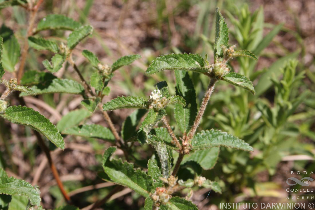 Hierbas anuales, monoicas, de 20-50 cm de alto; tallos algo leñosos en su base, de ramificación pseudo-dicotómica, con 2-4 ramas rodeando los ápices floríferos, indumento más o menos denso de tricomas estrellados, sésiles o subsésiles. Hojas alternas, pseudo-verticiladas en los nudos floríferos; pecíolos de 2-30 mm de largo, con 2 glándulas turbinadas subsésiles en el ápice, inmediatamente debajo de la unión con la lámina foliar; estípulas, lineares, pequeñas, persistentes, pilosas, con 2 ó 3 glándulas sésiles en la base y una en el ápice; láminas ovadas a oval-lanceoladas, de 2-5,5 × 0,8-2,2 cm, penninervadas, ápice agudo, base obtusa, margen aserrado con coléteres (dientes glandulíferos), indumento de tricomas estrellados en ambas caras, más denso en la cara abaxial. Inflorescencias terminales, racemiformes-subcapituladas, 2-sexuales, de 0,5-2,5 cm de largo, con 3-6 flores pistiladas basales y 4-10 flores estaminadas hacia el ápice, sin interrupción entre las dos; brácteas triangular-aciculares, de 1,2-2 mm de largo, con glándulas basales obpiriformes, sésiles. Flores estaminadas con pedicelo de 1-2 mm de largo; sépalos 5, ovados, de 2-2,5 mm de largo, estrellado-pubescentes en la cara externa; pétalos 5, subespatulados, de 1,5-2 mm de largo, con tricomas simples sobre el borde y cara dorsal, base barbada, sépalos y pétalos con puntos translúcidos; lóbulos del disco 5, libres, oblongos, de ápice discoide, carnoso; estambres 8-10, filamentos glabros; receptáculo pubescente. Flores pistiladas subsésiles; sépalos 5, angostamente espatulados, ca. 5 mm de largo, subiguales, de ápice agudo, estrellado-pubescentes en la cara externa, glabros o con algunos tricomas simples hacia el ápice en la cara interna; pétalos atrofiados en 5 filamentos muy breves, a menudo ausentes, con glándula apical ± cónica; ovario de contorno oblongo, de 4-6 mm de largo, con indumento de tricomas estrellado-porrectos; estilos 3, profundamente 2-fidos, con 6 terminaciones estigmáticas filiformes, de 2-2,5 mm de largo, blancuzcas. Fruto cápsulas de contorno oblongo, de 7-9 mm de largo, con tricomas estrellado-porrectos esparcidos, verdes con líneas blancuzcas en las suturas, sépalos acrescentes persistentes. Semillas subelipsoides, de 4-4,5 × 2,5-3 mm, comprimidas dorsiventralmente, ápice acuminado, parduzcas, lisas, brillantes, con carúncula subapical en el lado ventral.