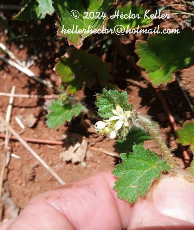 Hierbas a sufrútices prostrados, monoicas, de 5-40 cm de alto, bien ramificados desde la base, con raíz principal subleñosa, ramitas con tricomas estrellado-porrectos ferruginosos y escabrosos. Hojas alternas; pecíolo de 5-25 mm de largo, glándulas acropeciolares 2, con el estípite de 0,5-1 mm de largo, con el ápice pateliforme; estípulas filiformes, de 1-2 mm de largo; láminas suborbiculares a reniformes, de 10-18 × 12-20 mm, 5-nervadas desde la base, ápice redondeado a agudo, base truncada a cordada, margen con grandes dientes, escabrosa en ambas caras. Inflorescencias racemiformes terminales, 2-sexuales de 1,5-3,5 cm de largo, con 1-3 flores pistiladas basales, luego címulas de 4-6 flores estaminadas en el medio y en el ápice; brácteas aciculares, de 1-2,5 mm de largo. Flores estaminadas con pedicelo de 0,5-2 mm de largo; sépalos 5, ovados, de 1-1,5 mm de largo; pétalos 5, ligulados, de 1,5-2 mm de largo, ciliados en la base y en el ápice; estambres 10-15, filamentos ca. 2 mm de largo. Flores pistiladas con pedicelo de 1-2 mm de largo; sépalos 5, angostamente triangulares, de 2-3 mm de largo, subiguales, blancuzcos adaxialmente, con tricomas esparcidos con eje porrecto largo en el dorso; pétalos diminutos, glanduliformes y subulados; ovario globoso, de 2-3 mm de diámetro, densamente hirsuto con tricomas estrellado-porrectos; estilos 3, 2-furcados, con 6 terminaciones estigmáticas lineares. Fruto cápsulas depreso-globosas, de 4-5 mm de diámetro, estrellado-hirsutas. Semillas de contorno oblongo, ca. 3 × 2 mm, grisáceas, con carúncula subapical.
