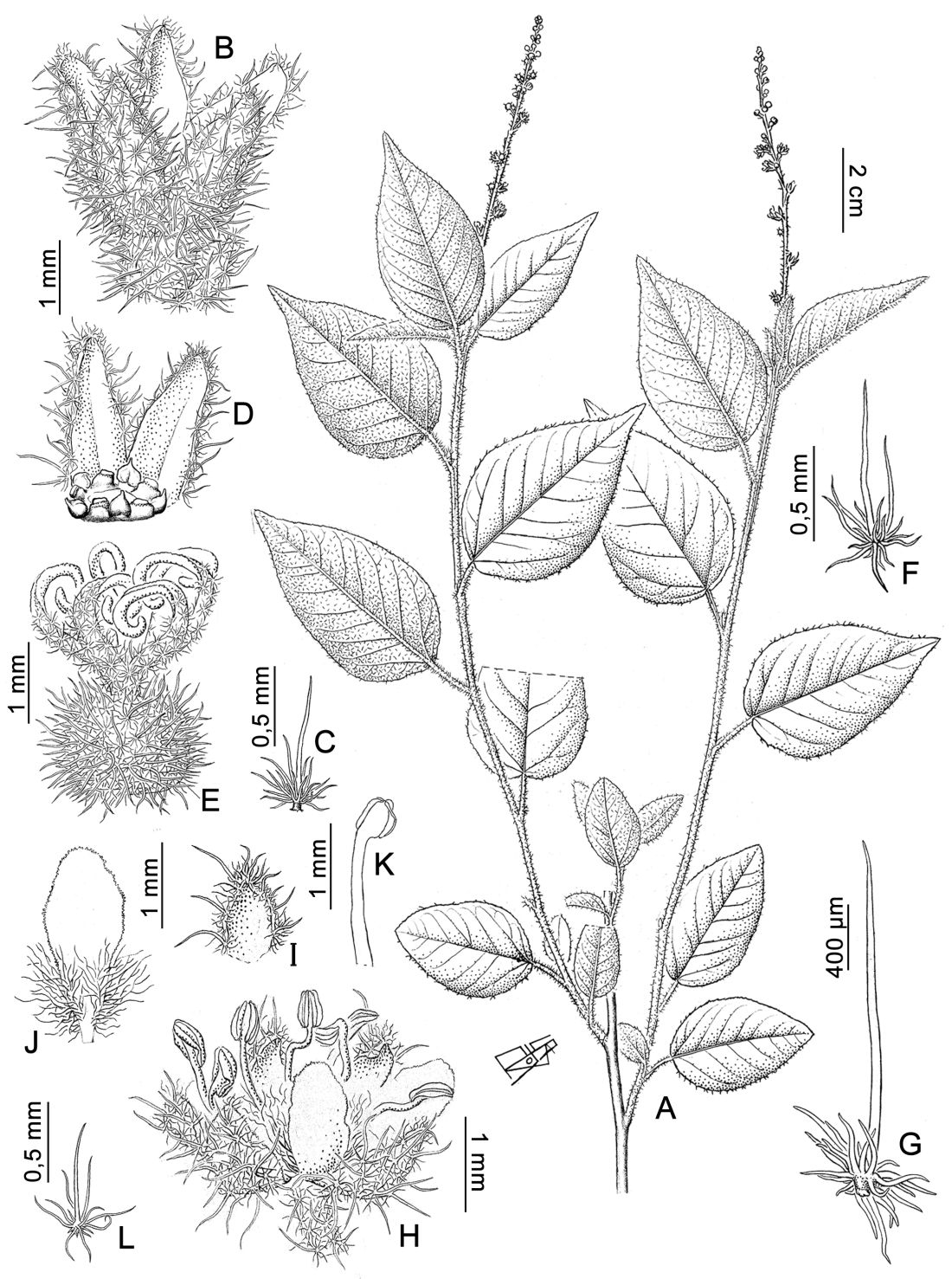 A. Planta. B. Cáliz pistilado. C. Tricoma de un sépalo pistilado, cara externa. D. Disco de la flor pistilada, con dos de los cinco sépalos. E. Gineceo. F. Tricoma del ovario. G. Tricoma del tallo. H. Flor estaminada. I. Sépalo de la flor estaminada. J. Pétalo de la flor estaminada. K. Estambre. L. Tricoma de un sépalo de la flor estaminada, lado externo.