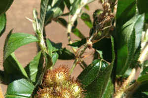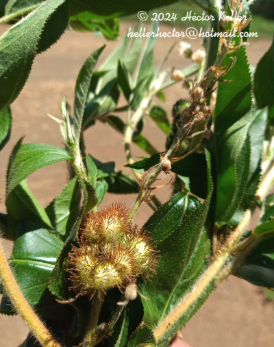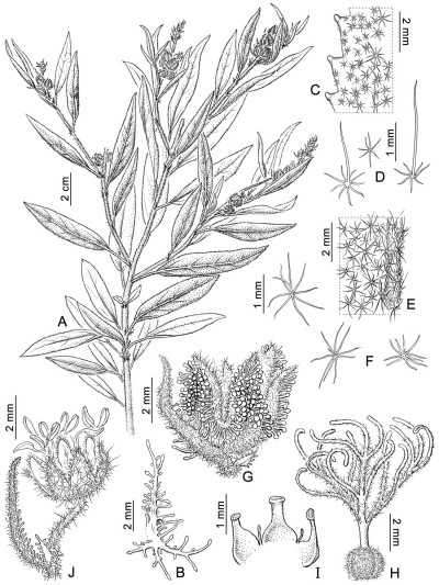 Arbustos monoicos, pegajosos y aromáticos, de 0,5-1,5(-2) m de alto; tallos jóvenes con tricomas estrellado-porrectos densos y blancuzcos. Hojas alternas; pecíolos de 0,5-2,4 cm de largo, sin glándulas acropeciolares; estípulas laciniado-divididas, de 3-7 mm de largo, con glándulas estipitadas viscosas; láminas elíptico-lanceoladas, de 3-7 × 1-3 cm, peninervadas con 8-12 nervios secundarios a cado lado del nervio central, ápice agudo, base aguda a atenuada, margen finamente aserrado, los dientes con un coléter oscuro en la punta, esparcida hasta densamente pubescentes en la cara adaxial, blanco-tomentosa en la cara abaxial. Inflorescencias terminales, racemiformes, 2-sexuales, de 2-7 cm de largo, con 4-12 flores pistiladas en la base y 20-45 flores estaminadas en la porción media y distal; brácteas lineares, de 4-7 mm de largo, arqueadas, pubescentes, el margen con glándulas brevemente estipitadas. Flores estaminadas con pedicelo de 2-3,5 mm de largo; sépalos 5, ovado-triangulares, de 2-3 mm de largo, pubescentes en el dorso, con glándulas brevemente estipitadas en el margen, acrescentes; pétalos 5, ligulado-espatulados, ca. 3 mm de largo, vilosos en el margen; estambres 10-12, filamentos de 3-4,5 mm de largo. Flores pistiladas con pedicelo de 1-2 mm de largo; sépalos 5, triangulares, de 4-6 × 3-4,5 mm, reduplicados, tomentosos, con dos hileras longitudinales de glándulas viscosas estipitadas en el dorso en cada sépalo (el estípite de 2-3 mm de largo con ápice engrosado y piriforme); pétalos lineares, de 0,4-0,6 mm de largo, con una glándula terminal; ovario subgloboso, ca. 5 mm diámetro, densamente hirsuto, estilos 3, unidos en la base, luego multífidos, con numerosas terminaciones estigmáticas involutas. Fruto cápsulas ovoides, de 6-7 mm de largo, blanco-tomentosas, inicialmente envueltas por los sépalos persistentes que se tornan patentes después de la dehiscencia, columela de 4-5 mm de largo. Semillas elipsoides, de 3-3,5 × 2-2,5 mm; carúncula elipsoide, subapical, blancuzca.