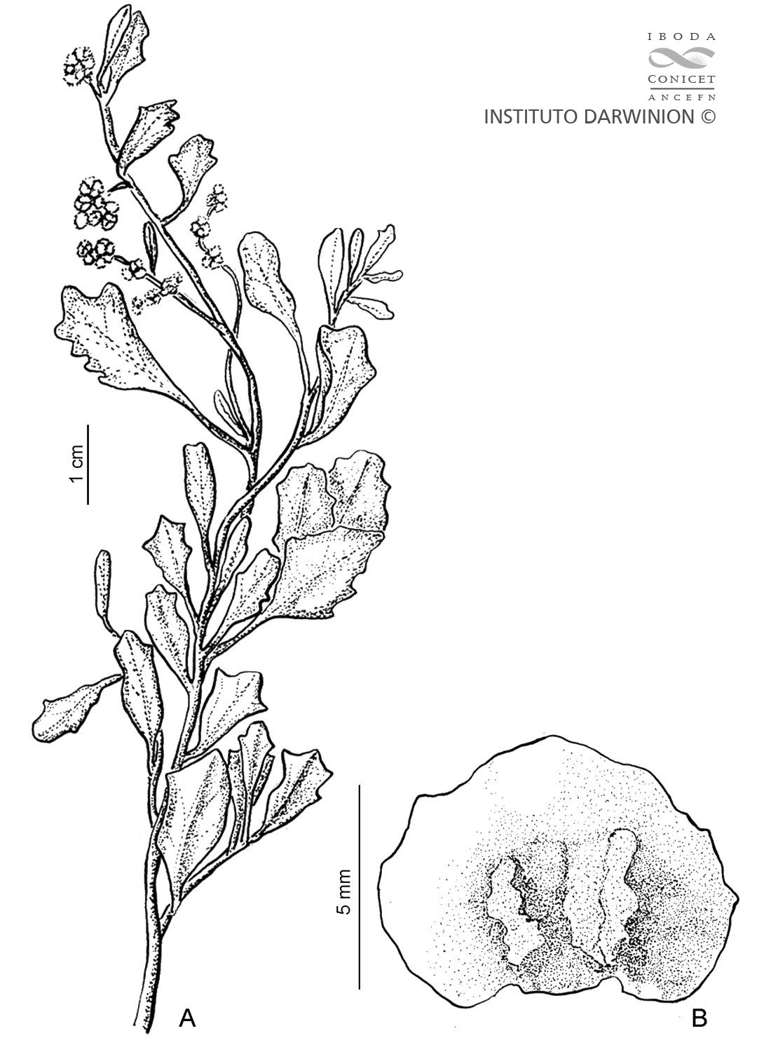 Plantas arbustivas, generalmente dioicas, de 0,8-2 m de alto. Hojas alternas, cortamente pecioladas, oblongas, elípticas, obovadas o triangulares, de 10-35 × 6-25 mm; margen entero o sinuado, base cuneada o truncada; ápice obtuso; anatomía Kranz. Inflorescencias en glomérulos agrupados en espigas terminales o axilares; flores estaminadas en glomérulos multifloros, flores carpeladas en glomérulos 4-6-floros. Bractéolas fructíferas transversalmente elipsoidales, coriáceas, de 2,5-5 × 3-5 mm, soldadas entre sí en la región basal; margen entero, ondeado o anguloso; cara externa lisa o con crestas. Semillas castañas; embrión con radícula ascendente. Subsp. grandibracteata.- Hojas de 8-40 × 3-30 mm; margen entero o apenas eroso. Bractéolas fructíferas de 5-8 × 5-8 mm; margen ondeado o anguloso; cara externa generalmente con crestas.