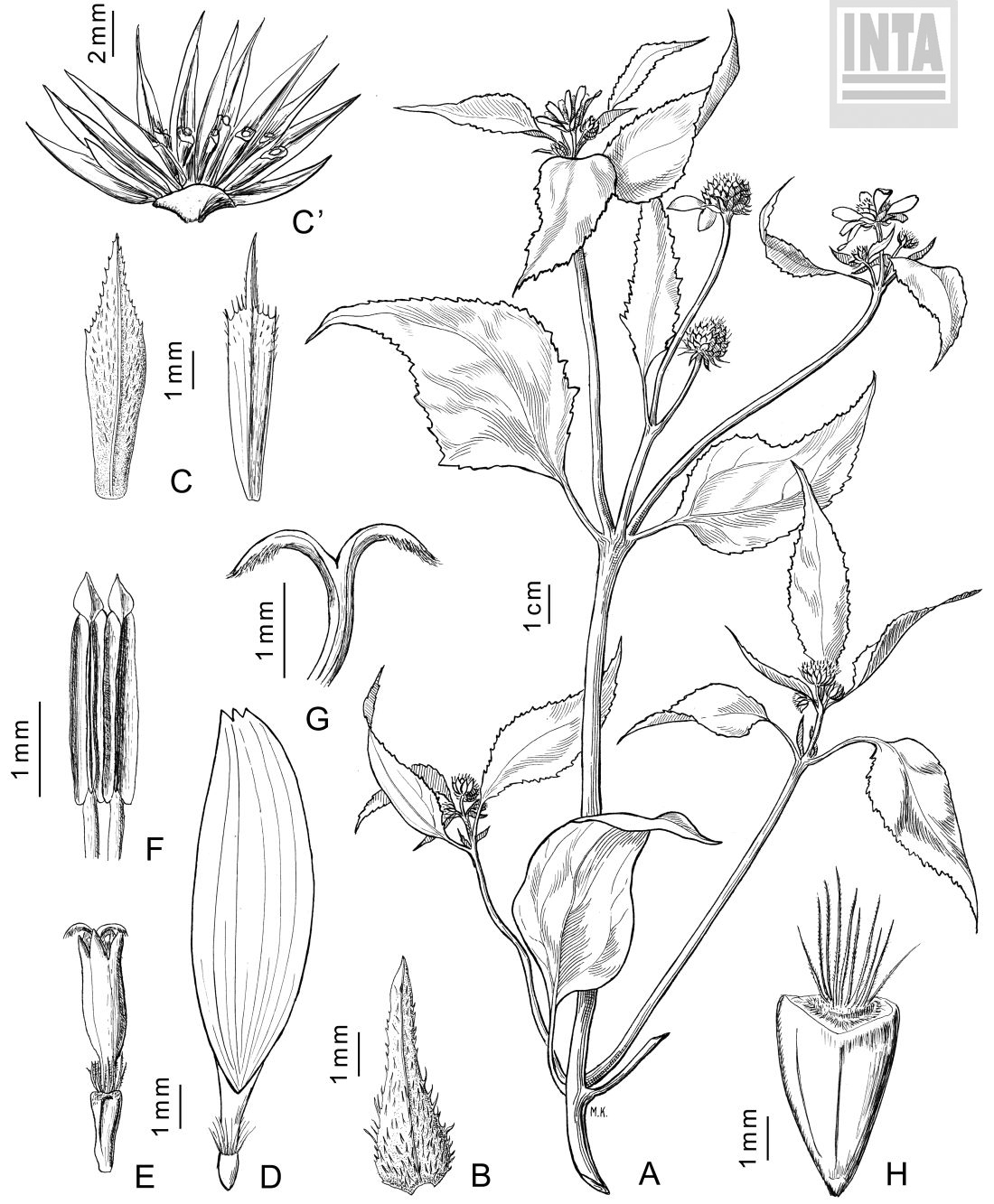 Hierbas anuales, erectas, hasta de 1,8 m de alto, ramosas, hojosas (tallos y hojas escábridas). Hojas opuestas, con pecíolos hasta de 4,5 cm de largo y láminas anchamente ovadas, de 5-11 × 2,5-7,5 cm, de base redondeada o cordada y ápice acuminado, aserradas hacia la base y hacia el ápice irregularmente dentadocrenadas, a veces algo discoloras, con pubescencia corta (pelos con la base ensanchada). Capítulos pedunculados, solitarios en la axila de las hojas o terminales, al estado maduro resultan casi globosos. Involucro hemisférico, de 4-6 × 8-12 mm; filarios 2- seriados, ovado-lanceolados, agudas, pubescentes, con ápice herbáceo. Receptáculo con páleas ovadas, coriáceas, abrazadoras, persistentes a la madurez, con base glabra, dorso piloso y terminadas en un acumen notable. Flores del margen neutras, con corola ligulada, amarillo-blanquecina, lígula elíptica, de 8-12 mm de largo, 3-dentada, las del centro perfectas, con corola tubulosa, ca. 3 mm de largo, amarilla, con tubo basal angosto y ensanchado hacia arriba. Anteras oscuras con base obtusa. Ramas estigmáticas con apéndice piloso, corto. Aquenios gruesos, obpiramidales, de 3-4 × 1-2 mm, 3-4-gonos, ápice truncado con pelitos. Papus formado por varias cerditas centrales, desiguales y caducas.