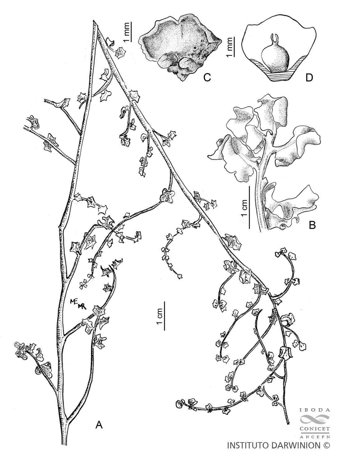 A. Rama florífera. B. Detalle de ramita con hojas. C-D. Bractéolas fructíferas, cara externa y cara interna con el fruto, respectivamente