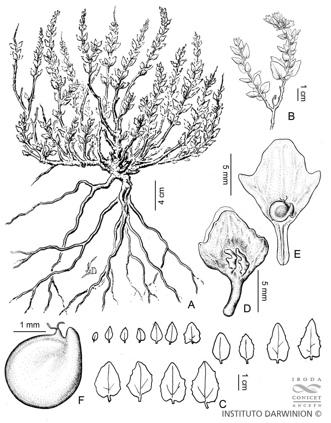 A. Planta. B. Detalle de una rama. C. Variabilidad de hojas. D-E. Bractéolas fructíferas, cara externa y cara interna con el fruto respectivamente. F. Semilla.