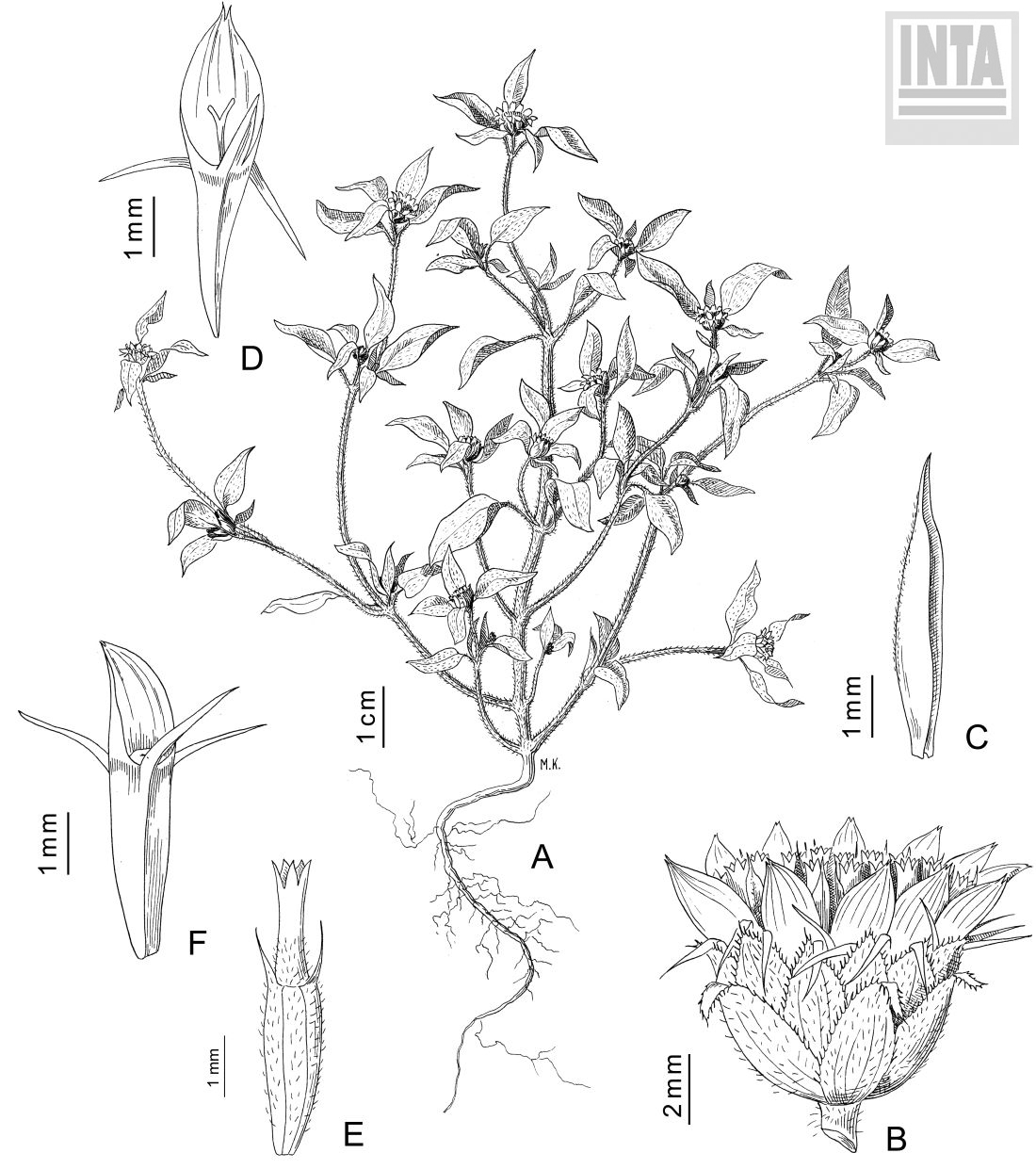 A. Planta. B. Capítulo. C. Pálea del receptáculo. D. Flor del margen. E. Flor del centro. F. Aquenio con el papus.