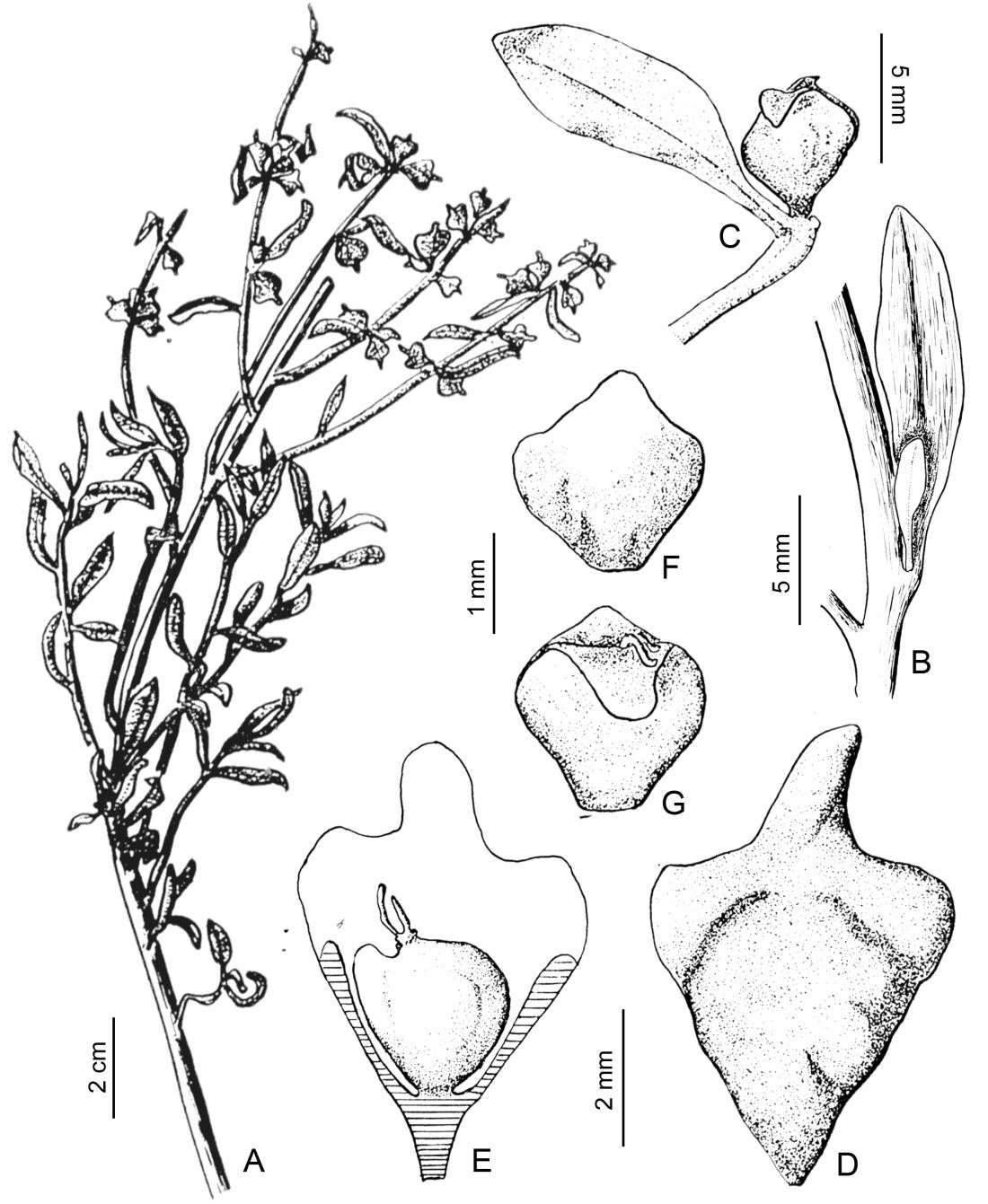 A. Rama florífera. B-C. Detalle de ramitas con hojas y bractéolas fructíferas, respectivamente. D-F-G. Bractéolas fructíferas, cara externa. E. Bractéola fructífera, cara interna con el fruto.