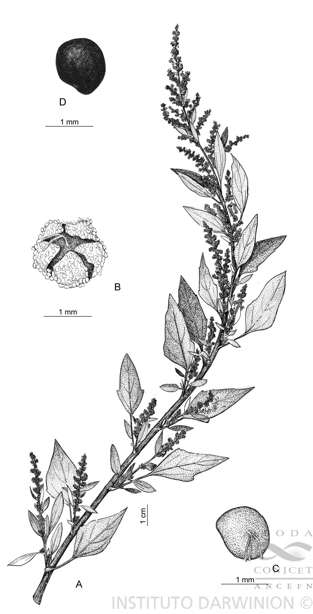 Observaciones: Nombres vulgares. “Granasche”, “quínoa”, “yuyo blanco” (Giusti, 1997); “ajara”, “cenizo”, “quino”, “quino-a”, “quinoa blanca criolla”, “quinoa cimarrona”, “quinoa negra”, “yuyo cenizo” (Tolaba, 2006).