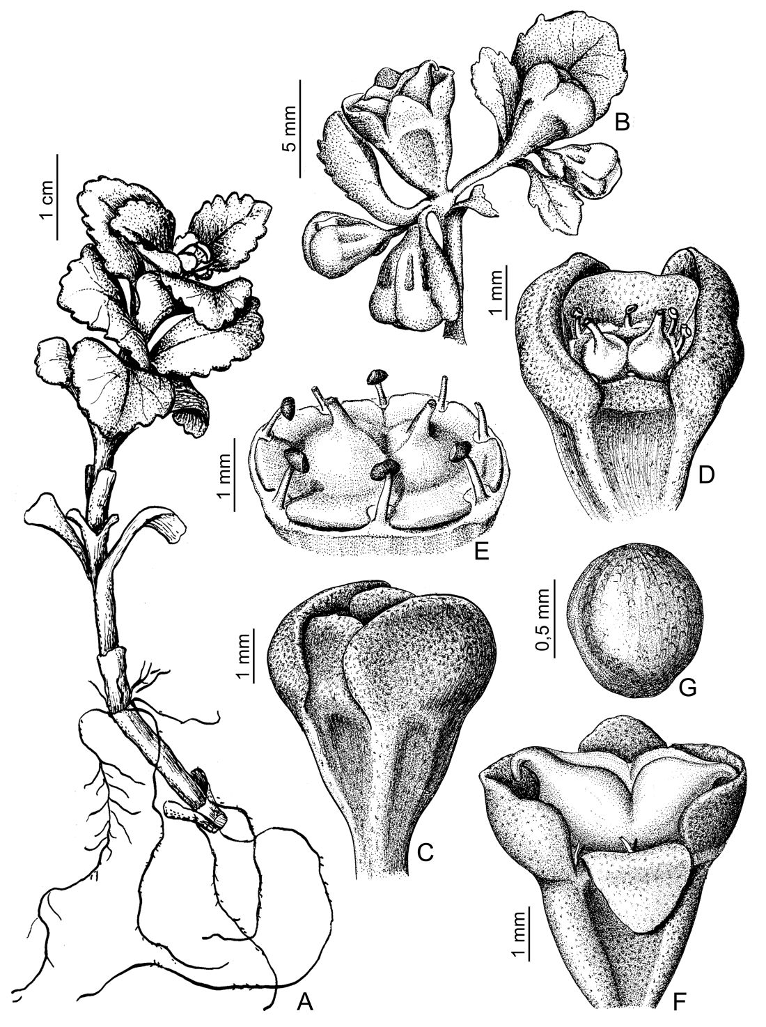 A. Planta. B. Porción de rama fl orífera. C. Flor. D. Flor desprovista de un sépalo. E. Androceo y gineceo. F. Fruto. G. Semilla.