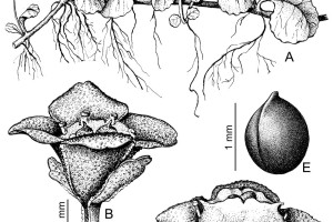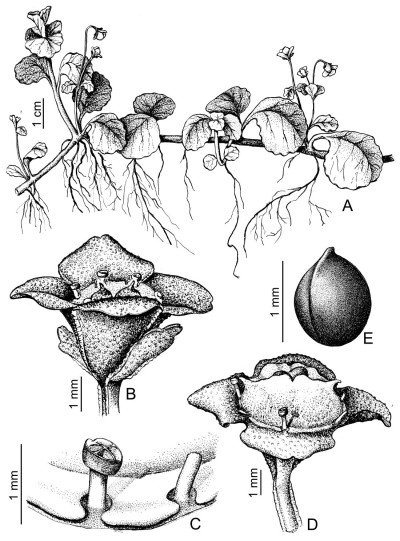 Hierba perenne, estolonífera; tallos alados y aparentemente 4-quetros, reptantes y radicantes en los nudos inferiores, glabros. Hojas opuestas, cortamente pseudopecioladas; láminas ovadas a suborbiculares, de 2,5-5 × 1-3,5 cm, de ápice redondeado, el margen cartilaginoso, dentadas, semicarnosas, discoloras. Flores solitarias, terminales, largamente pedunculadas; cáliz con lóbulos subobtusos, 3-5-nervados, carnosos. Fruto 2-lobado, hasta de 0,4 cm de largo. Semillas globosas, lisas, brillantes, castaño-oscuras.