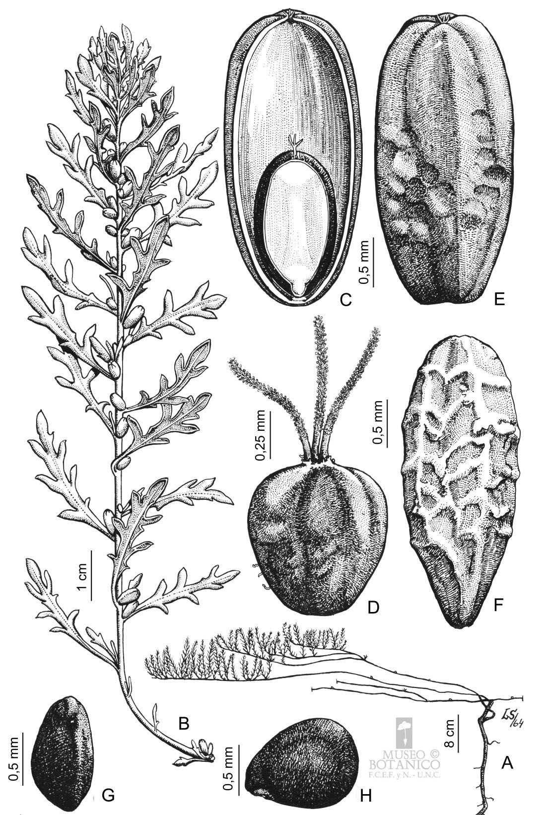 Hierbas perennes, aromáticas, pubescentes. Tallo algo engrosado en la base, muy ramificado; ramas anuales, postradas, delgadas, hasta de 0,9-1 m de largo. Hojas alternas, cortamente pecioladas, pinnatisectas, las inferiores hasta de 4 × 1,5 cm; margen revoluto; base cuneada; ápice agudo; las superiores más pequeñas; algunas plantas, después de haber fructificado reinician el crecimiento apical de las ramitas produciendo hojas ± espatuladas, de margen entero, en lugar de las normales. Inflorescencias en glomérulos axilares, sésiles, 1-8-floros. Flores perfectas; sépalos (4-)5 unidos hasta cerca del ápice; estambres (4-)5; filamentos acintados; estigmas 2-3, muy tenues, breves. Cáliz fructífero subgloboso a ovoide, de 1,6-1,8 mm de largo, cuyos sépalos se vuelven esponjosos y de superficie alveolada a la madurez, envolviendo completamente al fruto. Frutos utrículos lenticulares, de 0,9-1 mm de diámetro; pericarpo delgado, algo adherido a la semilla, con tricomas glandulares, adpresos. Semillas lenticulares, castañas; tegumento liso; embrión vertical.