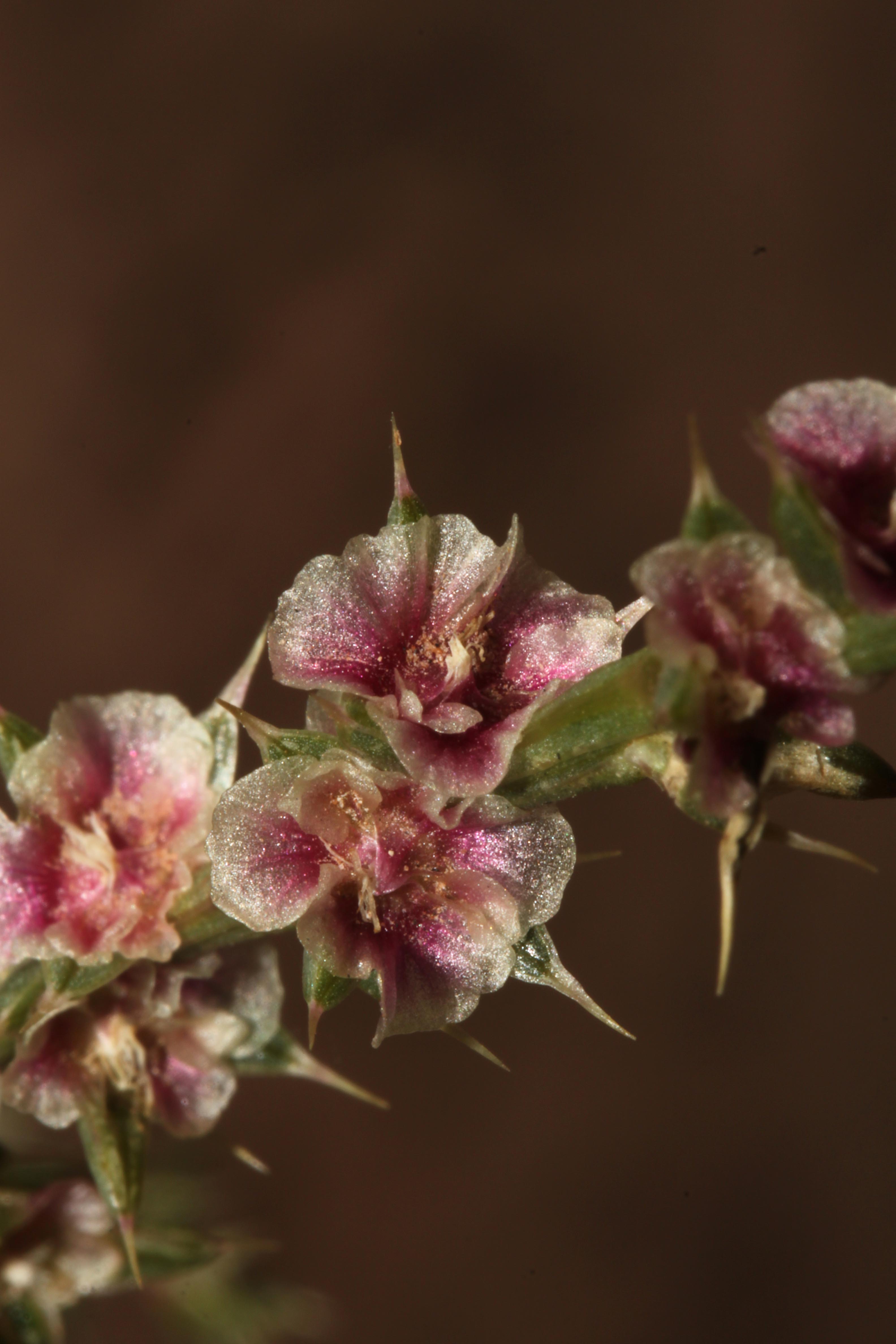 Hierbas monoicas, de 10-100 cm de alto, hasta de 150 cm de diámetro, subglabras, ± espinosas y punzantes. Tallos erectos, profusamente ramificados desde o cerca de la base; ramas arqueadas. Hojas alternas, sésiles, no carnosas, estrechamente lineales a filiformes, de 10-60 × 1-2,8 mm; margen entero; base no ensanchada; ápice subespinescente. Inflorescencias en espigas alargadas, interrumpidas a la madurez; 1 flor por bráctea, alternas, con en el ápice mucronulado-espinoso; bractéolas connadas en la base. Flores bisexuales; sépalos 5. Frutos utrículos, de 6-8(-9) mm de diámetro; sépalos fructíferos membranáceos, con 5 alas o sin ellas; cuando presentes las alas desiguales: 3 externas más anchas, en forma de riñón, transparentes y notoriamente nervadas, y 2 internas, más estrechas, cortas o reducidas a escamas en forma de lengua; sépalos inclinados sobre las alas sin formar un cono.