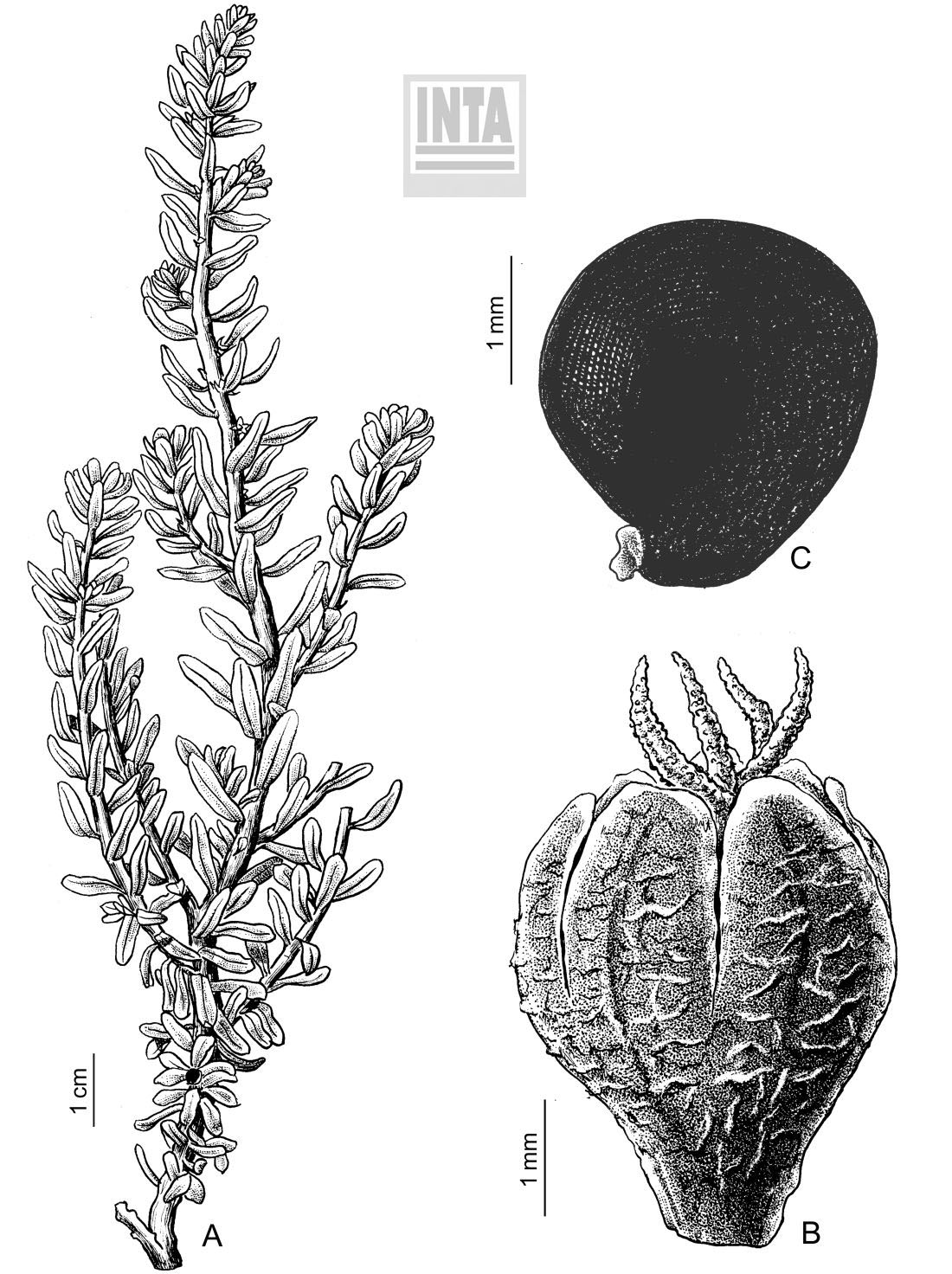 Arbustos ginodioicos, de 0,5-2 m de alto. Tallo muy ramificado; ramas erectas, estriadas. Hojas alternas, sésiles, lineares-oblongas a oblanceoladas, de 4-25 × 2-4 mm, dispuestas en ángulos menores a 90°, glaucas, carnosas, de sección semicircular; base ± truncada; ápice obtuso, a veces mucronado. Inflorescencias en glomérulos sésiles, (1-)3-5-floros, en la axila de las hojas en el extremo de las ramas; bractéolas 2(-3), ovadas a oblongas, quilladas, blanquecinas o castaño-pálidas, de margen irregularmente dentado a denticulado. Flores con (4-)5 sépalos; las estaminadas devienen de flores perfectas y presentan 5 estambres; las carpeladas con 3-5 estigmas. Frutos utrículos ± obcónicos, de 3,5 × 3 mm, rodeados por el cáliz que se vuelve carnoso; pericarpo membranáceo, adherente a la semilla. Semillas horizontales y verticales en la misma planta, lenticulares; tegumento negro, liso.