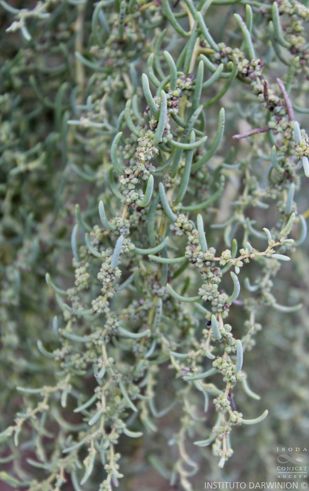 Arbustos ginodioicos, de 1-3 m de alto. Tallo erecto, ramoso; ramas divergentes. Hojas alternas, sésiles, lineares, de 10-50 × 1-3 mm, dispuestas en ángulos de 90°, glaucas, carnosas, de sección semicircular; base atenuada; ápice agudo, a veces mucronado. Inflorescencias en glomérulos sésiles, 3-5-floros, en la axila de las hojas en el extremo de las ramas; bractéolas 2-3, triangulares u ovadas, ligeramente mucronadas, quilladas, de color castaño claro, con el margen entero. Flores con 5 sépalos; las estaminadas devienen de flores perfectas y presentan 5 estambres; las carpeladas con 3-4 estigmas. Frutos utrículos ± subglobosos, de 2,2 × 2,3 mm, rodeados por el cáliz que se vuelve carnoso. Semillas verticales, lenticulares; tegumento negro, liso.