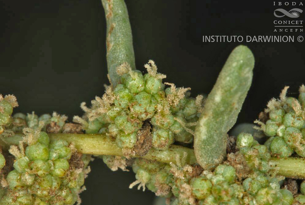 Arbustos ginodioicos, de 1-3 m de alto. Tallo erecto, ramoso; ramas divergentes. Hojas alternas, sésiles, lineares, de 10-50 × 1-3 mm, dispuestas en ángulos de 90°, glaucas, carnosas, de sección semicircular; base atenuada; ápice agudo, a veces mucronado. Inflorescencias en glomérulos sésiles, 3-5-floros, en la axila de las hojas en el extremo de las ramas; bractéolas 2-3, triangulares u ovadas, ligeramente mucronadas, quilladas, de color castaño claro, con el margen entero. Flores con 5 sépalos; las estaminadas devienen de flores perfectas y presentan 5 estambres; las carpeladas con 3-4 estigmas. Frutos utrículos ± subglobosos, de 2,2 × 2,3 mm, rodeados por el cáliz que se vuelve carnoso. Semillas verticales, lenticulares; tegumento negro, liso.