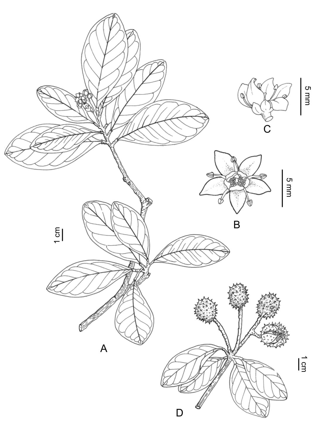 Arbustos o subarbustos hasta árboles de (2-)3-6(-8) m de alto; tronco hasta de 15 cm de diámetro; ramas rugosas longitudinalmente, con tricomas adpresos hacia la porción superior, el resto glabras. Hojas alternas a subopuestas; pecíolo de 8-17 mm de largo, ensanchando en la base y en el punto de articulación; láminas simples, obovadas a elípticas, de (4,5-)7-12 × 2,5-5 cm, base aguda, ápice redondeado, con 9-10 pares de nervios secundarios, puntos glandulares translúcidos, cara adaxial con tricomas adpresos dispersos, cara abaxial glabra, subcoriáceos. Inflorescencia una panícula pauciflora hasta de 5 cm de largo, terminal o axilar; ejes con tricomas adpresos. Flores 5-meras, ca. 10 mm de diámetro, sépalos ovadotriangulares, de 1,5-2 mm de largo, pubescentes y con puntos glandulares en la cara externa; pétalos ovados a elípticos, de 5-7 mm de largo, pubescentes y con puntos glandulares en la cara externa, carnosos, blancuzcos a castaño-claros y con manchas rojizas; estambres con filamentos ca. 2 mm de largo, glabros; disco cupuliforme, ondulado en el margen; ovario con protuberancias cónicas; estilo grueso, estigma capitado. Fruto una cápsula globosa de 2-2,5 cm de diámetro, de dehiscencia septicida y parcialmente loculicida, leñosa, cubierta de espinas cónicas; endocarpio castaño claro, liso, desprendiéndose a la madurez del resto del fruto. Semillas ovoideo-elipsoideas, lisas, castañas.