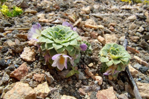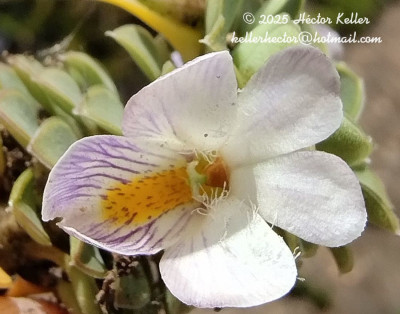 Sufrútice perenne, arrosetado; rizomas generalmente simples, a veces ramificados, erectos, gruesos; rosetas de 1,5-9 × 2-5 cm, columnares. Hojas espiraladas, imbricadas, dispuestas de manera compacta; láminas ovadas a anchamente ovadas o suborbiculares, de 2-8 × 2,5-9 mm, coriáceas, glabras, ápice mucronulado, márgenes enteros o finamente denticulados, cartilaginosos, blanquecinos, base truncado-redondeada, atenuada; pseudopecíolos de (5-)10-14 mm; estípulas ausentes. Flores de 7-10 mm, superando brevemente al follaje, blancas o lilas con líneas violetas y garganta amarilla; pedúnculos de 7-20 mm; bractéolas de 3,5-5,5 mm, insertas en la parte inferior del pedúnculo, subuladas; sépalos de 3,5-5(-7) mm, triangulares; pétalos superiores de 4-7(-8,5) × 1,5-3(-4) mm, oblongo-obovados, glabros; pétalos laterales de 4,5-7,5(- 9) × 1,5-3(-5) mm, obovados a elípticos, con escasos pelos claviformes hacia la base del margen superior; pétalo inferior de 5-8(-10) × (1,8-)3,5-8(-10) mm, oblongo-obovado o elíptico, truncado o algo emarginado, a veces profundamente obcordado, con dos hileras de pelos en la base hasta la abertura del espolón; espolón de 1,5-3 mm, subrectangular. Anteras de 1-1,5(2,5) mm; apéndice conectival apical de 1- 1,5(2,5) mm; apéndice basal de los estambres ventrales de 0,6- 2 mm, filiforme. Ovario de 1-2 mm, cónico; estilo algo geniculado en la base, infundibuliforme; cresta estilar oscuramente trilobada, lóbulos laterales patentes, lóbulo medio subnulo; estigma brevemente rostrado. Cápsulas de 3,5-4,5 mm; semillas no vistas.
