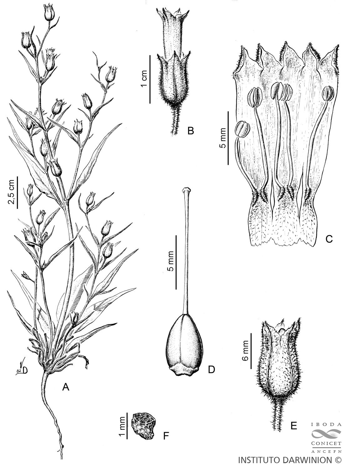 A. Planta. B. Flor. C. Corola desplegada. D. Gineceo. E. Fruto con cáliz. F. Semilla.