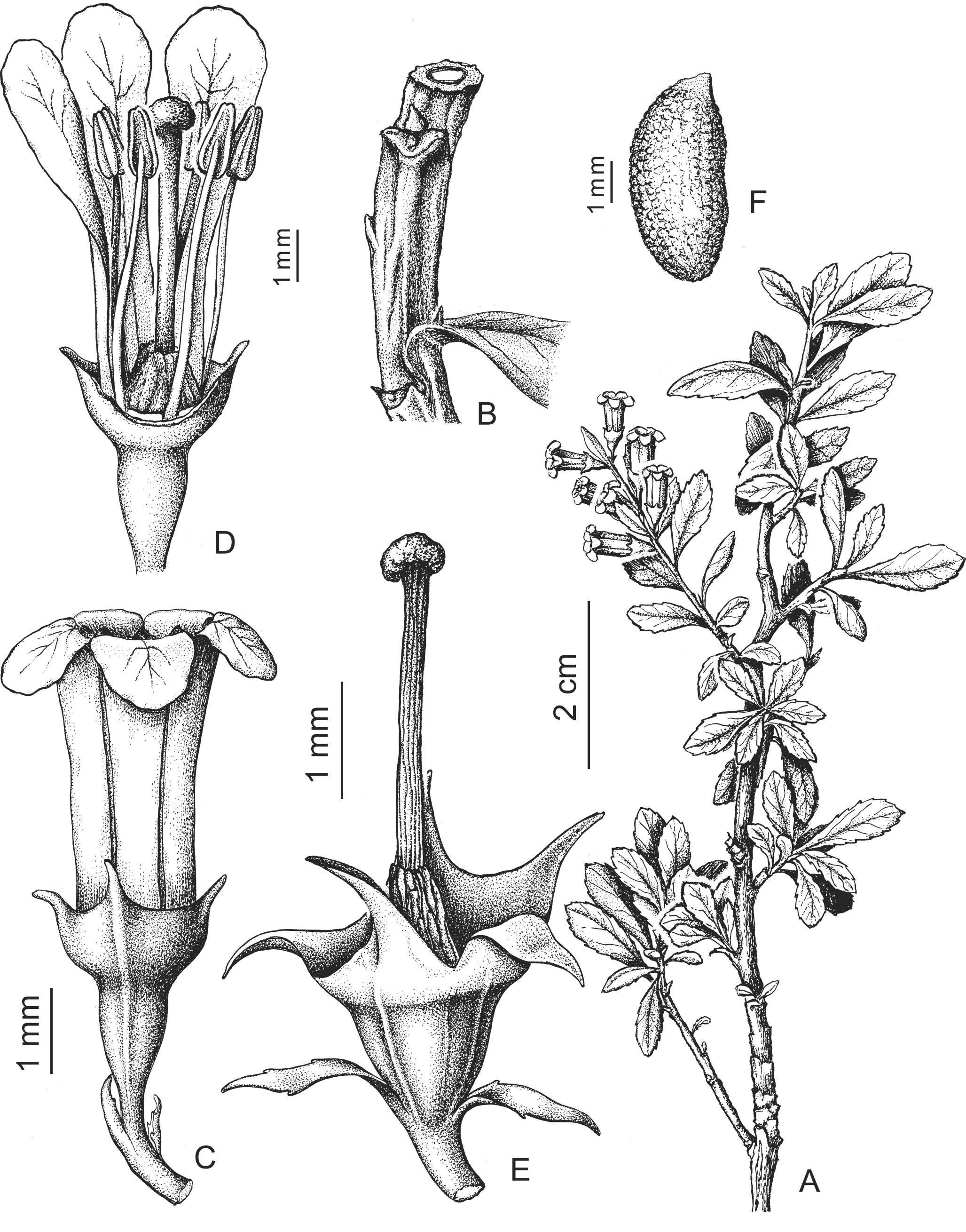 A. Rama florífera; flores agrupadas en pseudoracimos foliosos. B. Detalle de una porción de tallo. C. Flor. D. Flor (algunos pétalos y estambres removidos), disco intraestaminal marcadamente cónico. E. Cápsula. F. Semilla.