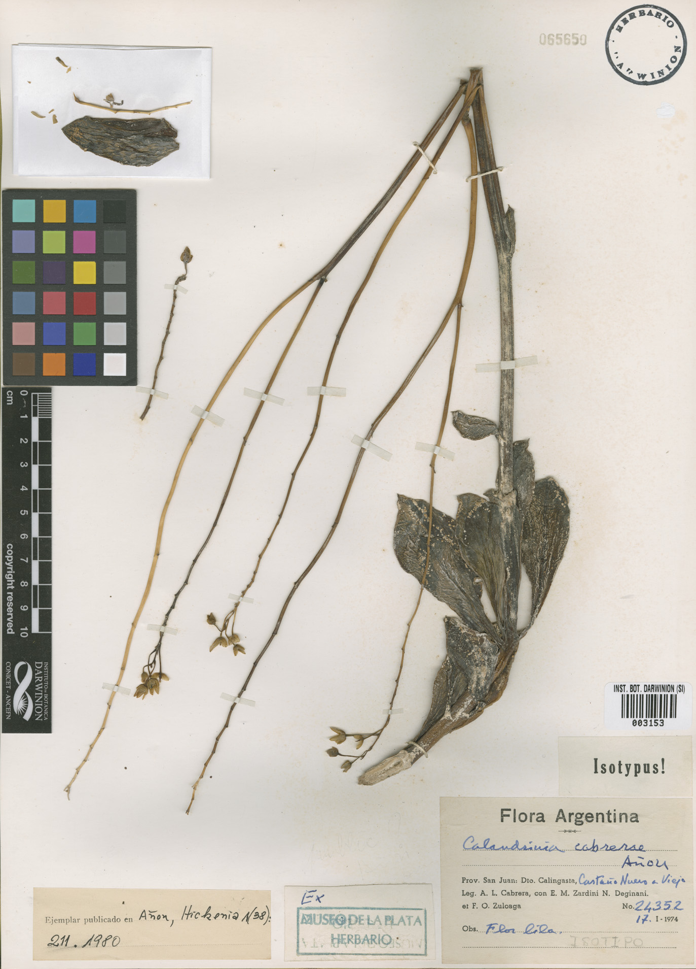 Hierba perenne hasta de 1 m de alto, el tallo con varias ramificaciones basales, glabras. Hojas alternas, carnosas, glaucas, a veces con tintes rojizos, las basales de 4-12 x 3-9 cm, obovadas u ovales, cuspidadas, atenuadas en el pecíolo, dispuestas densamente, las superiores de 2,5-6 x 1-3 cm, anchamente lanceoladas u ovales, algo agudas, sésiles o subsésiles. Inflorescencias en cincinos simples o dobles, raramente dicasios, con escapos florales de 40-60 cm de largo; flores con pedicelos de hasta 2 cm de largo; brácteas membranáceas, la menor angosta, la mayor oval, generalmente caducas; sépalos de 6-10 x 5-8 mm, ovales o suborbiculares, cuspidados, enteros, verde-glauco, a veces manchados en márgenes y nervaduras; corolas de 3-4 cm de diámetro, con 5-6(-8) pétalos, liliáceos-violáceos; estambres de 30(-70) con los filamentos lilacinos y vilosos; anteras amarillas; sstigma capitado, 3-lobulado. Fruto una cápsula igual o algo mayor que el cáliz. Semillas de 1,1 mm de diámetro, orbicular-reniformes, reticuladas, de color castaña-oscura.