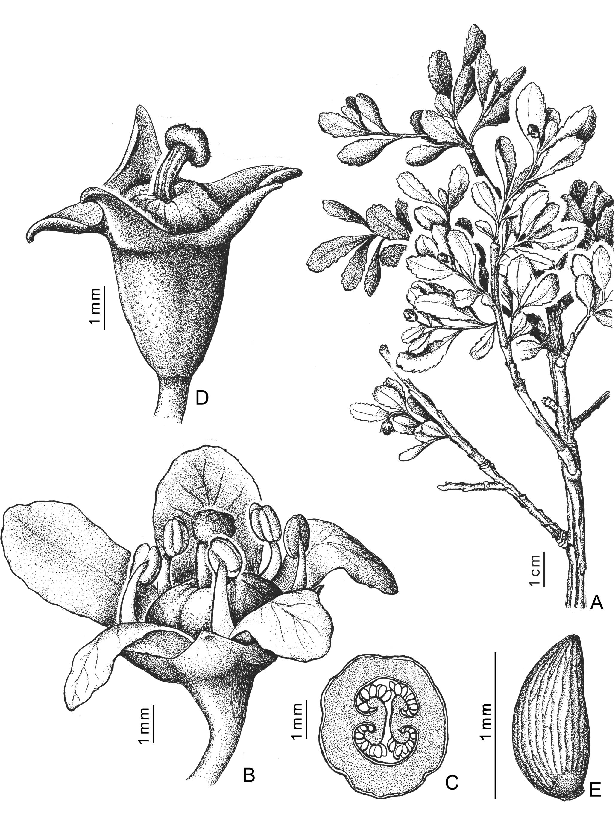 A. Rama con botones florales; flores solitarias en tallos jóvenes. B. Flor; disco intraestaminal marcadamente subcónico. C. Ovario, corte transversal. D. Cápsula. E. Semilla