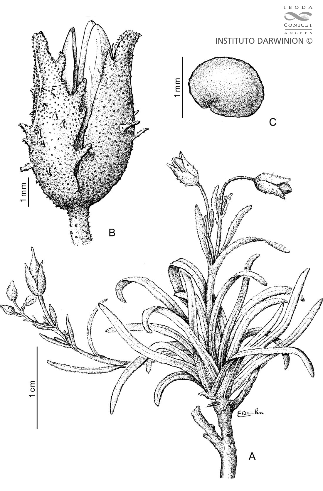 Hierba perenne, cespitosa, glabra, con los tallos de 6-12 cm de largo, prostrados en la base y luego ascendentes, ramosos. Hojas de 10-40 mm de largo, lineares, u oblanceolado-lineares, hacia la base dilatadas y con margen ciliolado, subcrasas, densamente agrupadas en la base de los escapos florales. Inflorescencias en seudocorimbos terminales con 6-10 flores; escapos del doble del largo de las hojas; brácteas 2-4, alternas, foliáceas, a veces denticuladas en el margen; sépalos de 5-10 mm de largo, anchamente ovados, con el margen irregularmente aserrado, con tricomas glandulosos en las crestas; pétalos 5, rosado intenso o violáceos; estambres 5-20; estigma 3-fido. Fruto una cápsula ovoide 3-valvar, dehiscente hasta la base, con frecuencia las valvas se encorvan hacia afuera. Semillas subreniformes a subcirculares, con leve reborde, casi lisas, negras y brillantes.