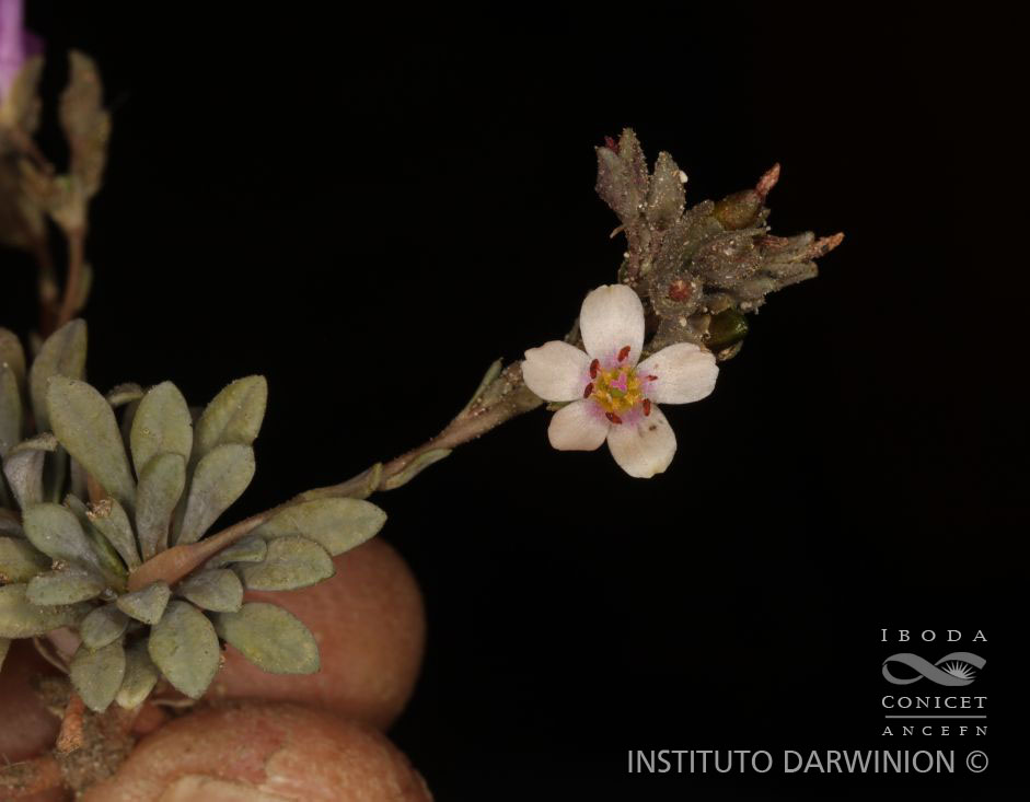 Calandrinia gayana Barnéoud Fl. Chil. 2(4): 503. 1846[1847] En el material chileno las brácteas sepaloides presentan una curiosa ornamentación: la cara abaxial se halla totalmente erizada de crestitas subdivididas a su vez y cubiertas ambas de pelitos glandulosos (dan la impresión de ser crespas) y las hojas son angostamente lineares. En el material argentino solo los bordes son irregularmente aserrados y poco glandulosos, el resto es glabro; y las hojas son linear-lanceoladas y la mitad de largas. En algunos ejemplares, no obstante, estos caracteres se presentan mezclados.