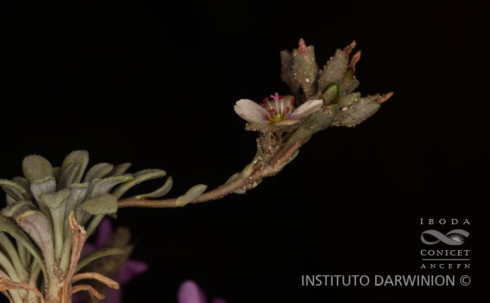 Hierba perenne, cespitosa, glabra, con los tallos de 6-12 cm de largo, prostrados en la base y luego ascendentes, ramosos. Hojas de 10-40 mm de largo, lineares, u oblanceolado-lineares, hacia la base dilatadas y con margen ciliolado, subcrasas, densamente agrupadas en la base de los escapos florales. Inflorescencias en seudocorimbos terminales con 6-10 flores; escapos del doble del largo de las hojas; brácteas 2-4, alternas, foliáceas, a veces denticuladas en el margen; sépalos de 5-10 mm de largo, anchamente ovados, con el margen irregularmente aserrado, con tricomas glandulosos en las crestas; pétalos 5, rosado intenso o violáceos; estambres 5-20; estigma 3-fido. Fruto una cápsula ovoide 3-valvar, dehiscente hasta la base, con frecuencia las valvas se encorvan hacia afuera. Semillas subreniformes a subcirculares, con leve reborde, casi lisas, negras y brillantes.