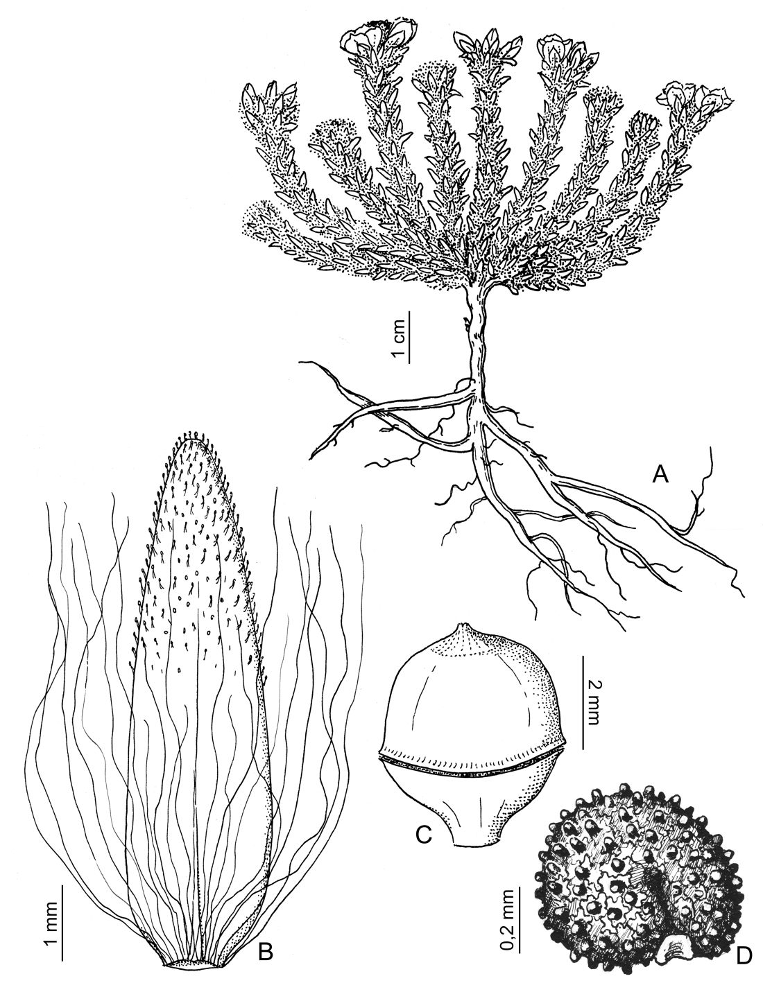 Hierba perenne con la raíz pivotante engrosada y tuberosa, con los tallos hasta de 10-15 cm de alto, completamente envueltos por las hojas y los pelos estipulares, que forman una cubierta blanquecina algodonosa. Hojas lineales o sublanceoladas, de 5-9(-10) x 1-2 mm de ancho, planas, de ápice atenuado-obtusas o subobtusas y con tricomas fino y glandulosos, distribuidos hacia la mitad apical de la hoja; talón peciolar, de 0,7-1 mm de largo; pelos estipulares de igual largo o mayores que la hoja, abundantes, lanosos, blancos. Flores 3-5, blancas, rosadas o rojo-purpura, rodeadas por un involucro de 8-14 hojas apicales; sépalos de 4-5 mm de largo, el mayor ovado-obtuso, con amplios márgenes hialinos hasta de 0;8 mm de ancho, el otro ovado-redondeado; pétalos de 7-8 mm de largo, purpúreos; estambres numerosos, generalmente más de 50, sobre un anillo ancho; estilo de 7-8 mm de largo, con 7-10 ramas estigmáticas lineares, de 1-1,5 mm de largo. Fruto una cápsula de 4-5 mm de largo, con la porción basal subdiscoidea o comprimida hacia la base, hasta subpedicelada, opérculo campanulado, dehiscente en el tercio inferior. Semillas cocleadas, de ca. 0,6 mm de diámetro, con pequeños tubérculos en la porción dorsal, negras o negro-rojizas, acerado-iridiscentes, brillantes.
