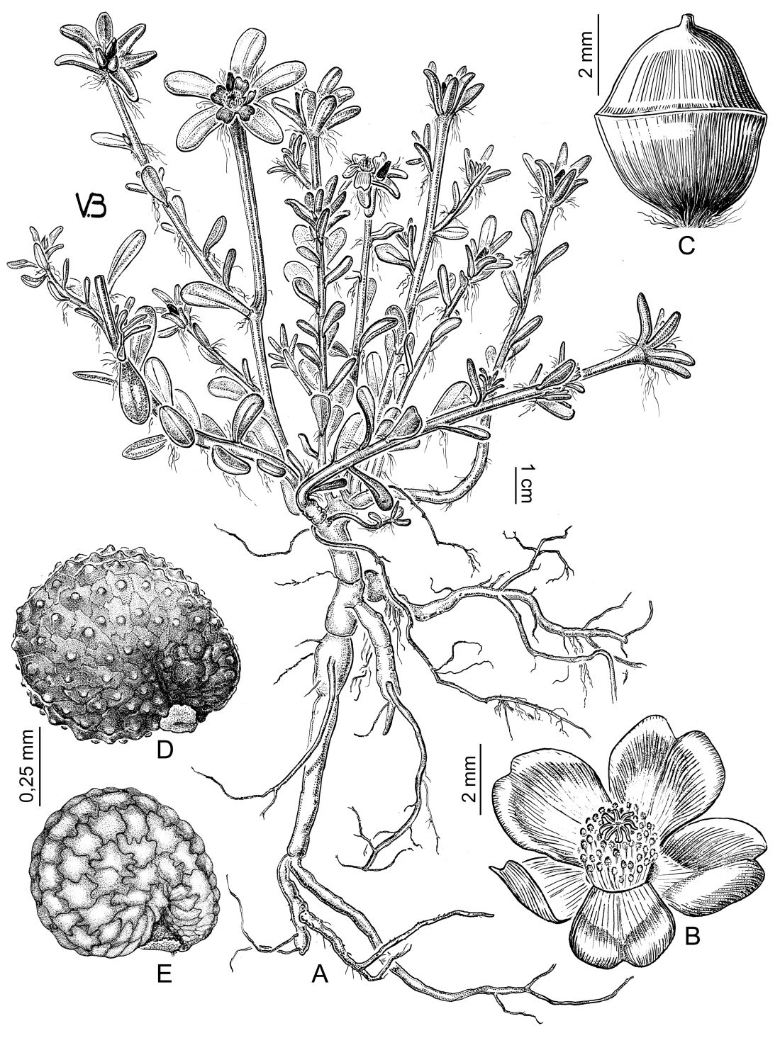 Hierba perenne, ascendente, ramificada. Hojas obovado-espatuladas, de 8-20 x 5-9 mm, planas, las apicales mas angostas y reunidas en verticilo de 5-6, frecuentemente sublineares y de ápice subagudo; pelos estipulares de 5-10 mm de largo. Flores solitarias con los pétalos obovados de 8-9 mm de largo, con una mácula basal rojo-negra; estambres ca 60; estilo blanco, con 5-6 ramas estigmáticas amarillas, de 2-2,5 mm de largo. Fruto una cápsula de 4-4,5 mm de largo, dehiscente más arriba de la mitad, con el opérculo ovalado, hemisférico. Semillas, de 0,6-0,7 mm de largo, con 4 hileras dorsales de tubérculos chatos y poco pronunciados, irregulares, cada tubérculo presenta 3-4 arrugas basales.