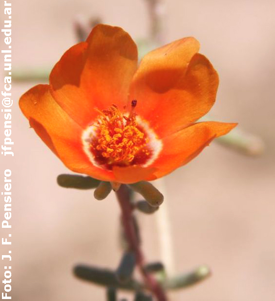 Panta anual, glabras, con los tallos algo carnosos, rojizos. Hojas linear-lanceolada a espatulada, de 1,5-3,5 x 0,2-0,5 cm, obtusas, de ápice truncado. Flores solitarias, de ca. 4 cm de diámetro, con los sépalos ovados, de 8-12 x 8-9 mm; pétalos obcordados, de 20-30 mm de largo, purpúreos con una mácula basal negra; flores rodeadas por 2-5 hojas apicales y bracteolas lineares, de 8-10 mm de largo; estambres 8-10 o mas; estilo de ca. 10 mm de largo, con 5 ramas estigmáticas de 2 mm de largo. Fruto una cápsula, de 7-10 mm de largo, ocupada en su mayor parte por el opérculo acampanado hasta cónico, de ca. 6 mm de largo. Semillas de 1,7-2 mm de diámetro, achatadas, con 4 hilares dorsales de grandes espinas anseriformes, de 0,3-0,4 mm de largo, pardo-rojizas.